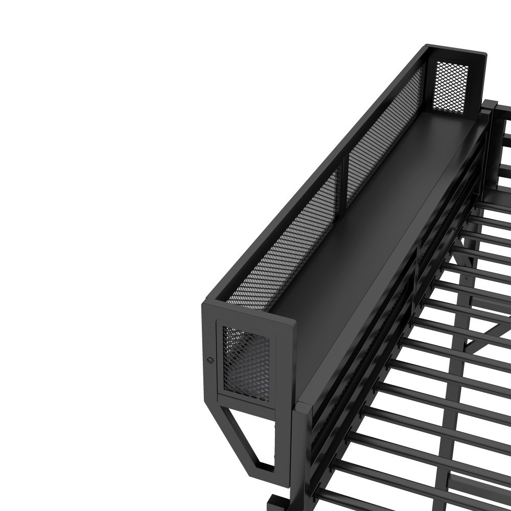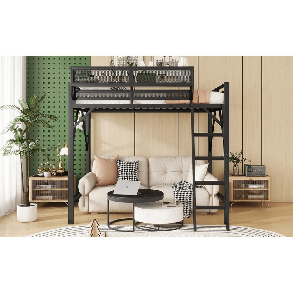 Queen Size Loft Bed with Ladder, Metal Queen Loft Bed with Storage Shelves Black Features 【Queen Loft Bed with Storage Shelves for Upper】The queen metal loft bed features a storage shelf on the upper bed providing extra storage space. This shelf is perfect for keeping books, gadgets, or small items within easy reach. The shelf have mesh around which prevent the thing fall down. It adds functionality without compromising space. 【Metal Queen Loft Bed with Ladder】The full loft bed with 4 step ladder, each step is equipped with non-slip foam padding, not only preventing slips but also add comfort by reducing foot pressure while climbing up and down. This thoughtful design greatly enhances safety, especially for children, while also making the bed more comfortable to use. 【Under Space of Metal Loft Bed】 54.3 inch under the queen loft bed creates extra space for multi-functional use. You can place storage cabinets, a small sofa, or a desk underneath, maximizing the use of limited space and creating a versatile living area. 【Safety Design】The plastic stopper design can fix the slats firmly to prevent the noise from moving slats, ensuring an immersive sleep experience. Feature guardrails on upper bed prevent your child from falling. 【Durable and Sturdy Construction】The queen size metal loft bed made from high-quality metal, this loft bed is durable and sturdy. The metal material ensures long-lasting use and stability, while also offering a sleek and modern look that fits well in any bedroom.Weight capacity is 400LBS. Descriptions Queen Size Loft Bed with Ladder, Metal Queen Loft Bed with Storage Shelves, High Loft Bed for This queen size loft bed features built-in storage shelves on the upper bed. The sturdy metal design ensures stability and durability, making your bedtime routine more organized and efficient. Specification Color: Black Material: Metal Overall Dimensions: 82.7*63*73.6” (L x W x H) Size: Queen Size Height of Upper Guardrail: 13" Clearance Under the Bed 54.3" Recommended Mattress Thickness 6”(not included) Weight Capacity: 400LBS Net Weight: 94.6 lbs Gross Weight 102.3 lbs Box Spring Required No Country of Origin China