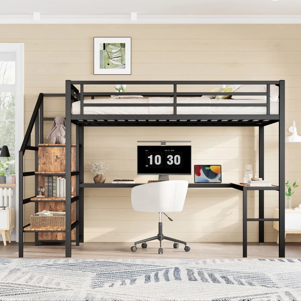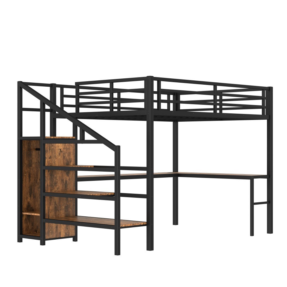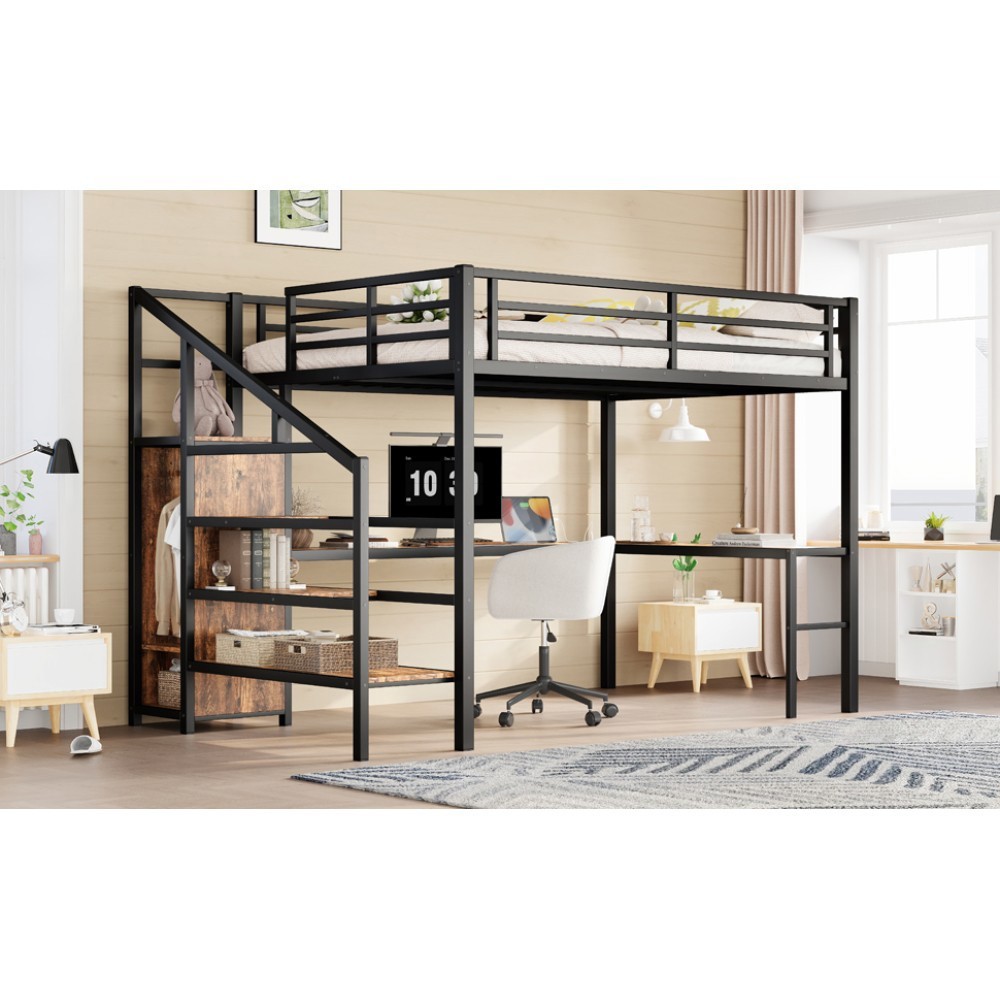 Queen Size Loft Bed with L-shaped Desk and USB, Metal Loft Bed with Wardrobe Features Queen Size Loft Bed with Wardrobe and Stairs - The loft bed has a wardrobe that comes with its own hanging rod and an adjustable divider at the bottom, which can be used to store quilts, storage boxes or shoes. The versatile built-in staircase can also be used as storage space and can be fitted left or right as required. Space-Saving Loft Bed & Workspace - This metal loft bed has a cozy sleeping space, and a spacious and practical L-shaped desk underneath that can be used as a workbench, reading area, etc. where you can create your own little world. The space-saving design adds a touch of elegance to any bedroom. Loft Bed with USB and LED - The queen size bed's desk comes with a USB charging station for charging electronics that is convenience to your daily life.The LED light strip adds a sense of ambiance to your room while making it easy for you to wake up at night. Solid Metal Loft Bed - The bed frame is made of metal for strength and stability, and the upper bunk can hold up to 350 pounds. Queen size loft bed frame comes with sturdy stairs so kids can safely climb to the upper bunk and full-length guardrails keep kids safe while sleeping. Easy Assembly - Some assembly will be required, each order comes with clear and detailed instructions and numbered parts with all the necessary tools so you can get your bed assembled quickly. Notes: This metal loft bed will be packaged in two boxes, excluding the mattress! Descriptions Description If you need a versatile bed, then our metal loft beds are the perfect choice. The queen-size upper bed provides you with plenty of sleeping space, and the desk below is the perfect area to work and study. In addition, the queen size loft bed comes with a built-in closet that can be used for storing your daily clothes and supplies, and the interchangeable left and right staircases allow for storage while keeping it sturdy. The USB and LED lights are designed to provide you with great convenience. Quality metal materials and a minimalist black design make this loft bed an eye-catcher in the bedroom. Description & Dimensions Product Type Metal Loft Bed Material Metal Size Queen Color Black Wood-grain Numbers of Package 2 Overall Product Dimension 98.43''L x 62.99''W x 68.90''H Overall Product Weight 179.46 LBS Weight Capacity 350 LBS Box Spring Required No Recommend Bed Mattress Thickness 6'' Package Dimension & Weight Please refer to the Specification