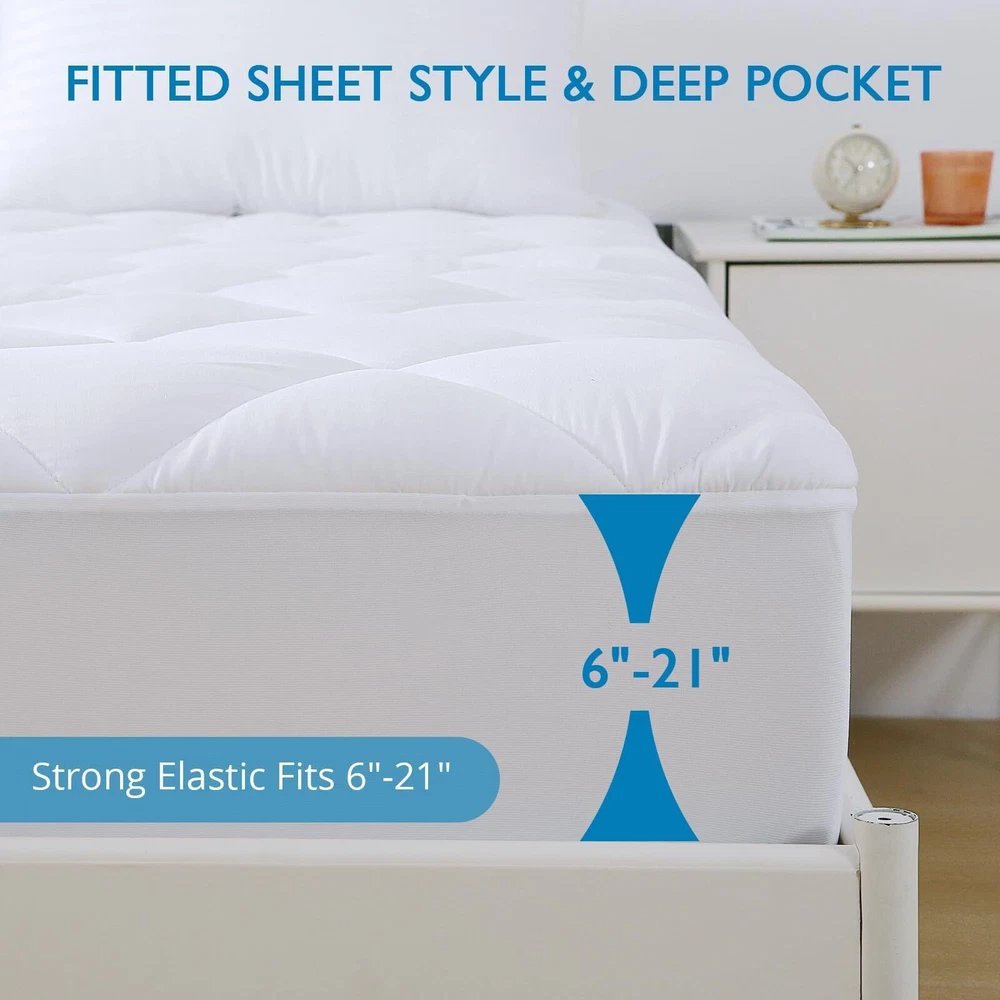 Premium Mattress Protection: Our queen size mattress protector shields your mattress from sweat, spills, and stains, keeping it pristine. It is suitable for for new mothers, pets and the elderly, ensuring a clean and healthy sleeping environment 100% Waterproof Assurance: This waterproof mattress protector uses premium TPU backing to create a moisture barrier, ensuring your mattress stays dry. Ideal for families with babys and pets, providing peace of mind Softness & Breathability: Crafted with microfiber and thick filling, our mattress pad offers unparalleled softness and breathability. Experience a luxurious sleep every night with our comfortable and cozy mattress cover Deep Pocket: The queen mattress cover features deep pockets and elasticated corners, fitting mattresses from 6 to 21 inches thick. This fitted sheet design ensures a secure fit and wrinkless Effortless Maintenance: Our mattress protector is machine washable and can endure over 90 cycles of gentle washing. Easy to clean and maintain, it’s suitable for busy households with frequent spills