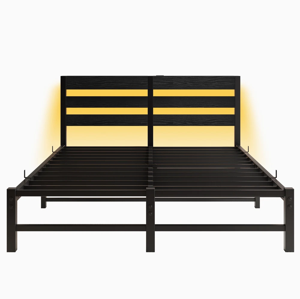 Queen Size Metal Bed Frame with Wooden Headboard, RGB Lights, Charger, Storage