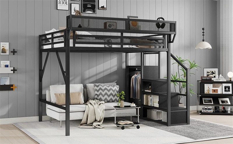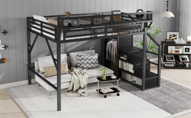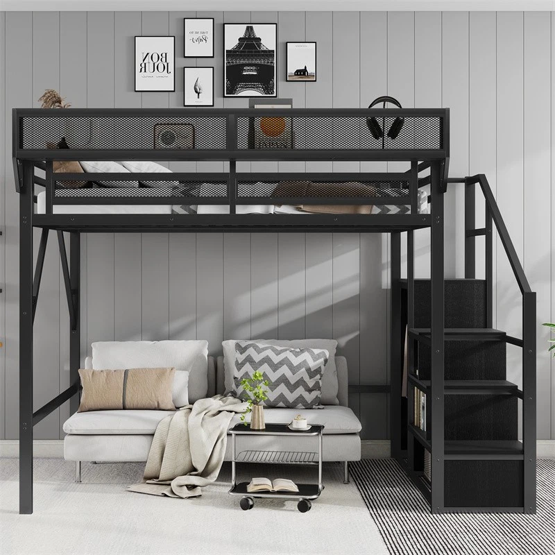 Queen Size Metal High Loft Bed w/Storage Shelves,Storage Stairs & Wardrobe,Black Features 【Queen Loft Bed with Storage Shelves for Upper】The queen metal loft bed features a storage shelf next to the upper bed, providing extra storage space. This shelf is perfect for keeping books, gadgets, or small items within easy reach. The shelf have mesh around which prevent thing falling down. It adds functionality without compromising space. Metal queen Loft Bed with Staircase】The metal queen size loft bed come with staircase includes built-in storage compartments, making it easy to store items like shoes, toys, or blankets. The steps ensure safe and convenient access to the upper bed, enhancing both practicality and safety. The stairs can be installed on either right side or left side. 【Under Space of Metal Loft Bed】54.3 inch under the queen loft bed creates extra space for multi-functional use. You can place storage cabinets, a small sofa, or a desk underneath, maximizing the use of limited space and creating a versatile living area. 【Metal Loft Bed with Wardrobe】The staircase features a built-in wardrobe function, providing additional storage for clothes and accessories. This clever design adds more functionality to the metal queen loft bed, making it a perfect solution for small bedrooms. 【Durable and Sturdy Construction】The queen size metal loft bed made from high-quality metal, this loft bed is durable and sturdy. The metal material ensures long-lasting use and stability, while also offering a sleek and modern look that fits well in any bedroom.Weight capacity is 400LBS. Descriptions Queen Size Loft Bed with Stairs, Metal Queen Loft Bed with Storage Shelves This queen size loft bed features built-in storage shelves next to the upper bed. Come with staircase and wardrobe. The sturdy metal design ensures stability and durability, making your bedtime routine more organized and efficient. Description & Dimensions Color: Black Material: Metal Overall Dimensions: 99.4” x 63.4”x 73.4” (L x W x H) Size: Queen Size Height of Upper Guardrail: 11.3" Clearance Under the Bed 54.3" Recommended Mattress Thickness 6”(not included) Weight Capacity: 400LBS Net Weight: 168.3 lbs Gross Weight 182.82 lbs Box Spring Required No Country of Origin China