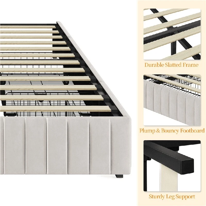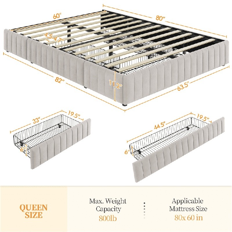 You may also like Metal Platform Bed Frame Twin No Box Spring Easy Assembly Headboard Compatible 118.31 USD 124.54 USD Free shipping 5% off Sturdy Twin XL Bed Frame Metal Foundation Heavy Duty Mattress Support Storage US 112.45 USD 118.37 USD Free shipping 5% off Rattan Wooden Platform Bed Full Size W/ Headboard Slat Support Easy Assembly New 222.17 USD 233.86 USD Free shipping 5% off Metal Platform Full Bed Vintage Headboard Sturdy Adult Steel Frame Storage New 95.26 USD 100.27 USD Free shipping 5% off Faux Leather Queen Platform Bed W/ Padded Headboard Box Spring Required Assembly 120.99 USD 127.36 USD Free shipping 5% off Twin over Twin Junior Bunk Bed Metal Frame Low Profile W/ Guardrails Ladder New 146.07 USD 153.76 USD Free shipping 5% off Durable Upholstered Platform Bed Frame Low Profile Slat Support Heavy Duty New 185.27 USD 195.02 USD Free shipping 5% off Kids Twin Metal Bed Frame Bowknot Headboard Easy Assembly Under Bed Storage New 59.47 USD 62.6 USD Free shipping 5% off Twin Metal Bed Frame 7 Inch Easy Assembly Headboard Compatible Recessed Legs New 55.38 USD 58.3 USD Free shipping 5% off Heavy Duty Steel Slat Bed Frame Twin Storage No Box Spring Easy Assemble New 50.35 USD 53.0 USD Free shipping 5% off Upholstered Queen Bed W/ Nailhead Trim Solid Wood Frame Assembly Required New 101.14 USD 106.46 USD Free shipping 5% off Heavy Duty 4" Thick Box Spring Full Bed Metal Foundation Easy Assembly Non Slip 139.47 USD Free shipping This upholstered bed frame with drawers would be right at home in a five-star hotel – and in your bedroom, of course. The no-fixed headboard design can customize your desirable backdrop according to your style, and the frame is crafted from sturdy metal and wood slats. Available in your choice of neutral hues, this bed just might inspire you to redo the entire room around it. We love how the drawer-storage design provides a large amount of space as you organize or hide daily essentials before falling asleep. More importantly, this bed doesn't require a box spring, so it's ready to support your mattress right away. Suitable for Adult. Simple & Modern: Low-profile frame opens up any room. Modern design with a simple color fits various types of home decor. The striped pattern of the side panel combined upholstered bed frame enriches your room with a classic and chic look Without Fixed Headboard: Without fixed headboard design, this upholstered bed frame is easily blended with room decor. That means you can customize your desirable backdrop according to your style Firm Support System: The frame is made from engineered wood and sits on metal legs, designed to support a mattress of your choice, supporting a maximum weight capacity of 800 lb Cushion-padded Side Panel: Thanks to the thick and soft foam-cushioned side panel with a striped pattern, your bedrooms improve a sense of soft-to-touch feeling and a fresh look, upgrading to the next level Easy Assembly Required: With the help of step-by-step assembly instructions and the included tools, two adults can finish the setup within an hour Specifications: Color: Beige; Slat Quantity: 12; Materials: Plywood, MDF, Metal, Foam, Velvet Fabric; Assembled Dimensions: 82 ″ L × 63. 5 ″ W × 11. 5 ″ H; Maximum Weight Capacity: Total: 800 lb; Big Drawer: 33 lb; Small Drawer: 22 lb Bathroom Sink Hair Catcher Stainless Steel Drain Protector Universal Fit 1 Pack 18.75 USD 19.74 USD Free shipping 5% off Coconut Clumping Cat Litter 2 Pack All Natural Lightweight Odor Control 8.5 lbs 44.97 USD 47.34 USD Free shipping 5% off 4.00-6 Wheelbarrow Tire All-Terrain Utility Non-Radial Load A Durable Traction 25.12 USD 26.44 USD Free shipping 5% off Hanging Closet Organizer W/ 6 Shelves & 3 Side Pockets Adult Clothes Storage New 27.29 USD 28.73 USD Free shipping 5% off Self Adhesive Shelf Liner Gridded Back Easy Peel No Residue 2 Pack 30 SQ FT New 13.15 USD 13.84 USD Free shipping 5% off 8in Wheel Replacement Walk-Behind Mowers Troy-Bilt Snapper Yard Machine Murray 29.3 USD 30.84 USD Free shipping 5% off Bermudagrass Grass Seed Mix Full Sun Fast Establishment Drought Tolerant 8.75 lb 48.49 USD 51.04 USD Free shipping 5% off Extreme Odor Control Small Animal Bedding 99% Dust Free Absorbent Nesting New 17.38 USD 18.29 USD Free shipping 5% off Programmable 1 Zone Water Timer Automatic Garden Irrigation Flow Control System 44.37 USD 46.71 USD Free shipping 5% off Allergen Defense HVAC Air Filter 800 MPR pleated 3-in-1 technology cleaner air 17.38 USD 18.29 USD Free shipping 5% off Dipped Dog Biscuits Peanut Butter Flavor Crunchy Treats All Sizes 32oz 2Count 25.09 USD 26.41 USD Free shipping 5% off Waterproof Mattress Pad 200 Thread Count Twin Cotton Hypoallergenic Protector US 27.45 USD 28.89 USD Free shipping 5% off
