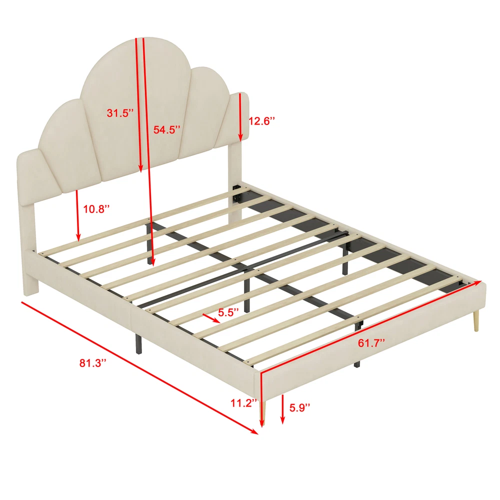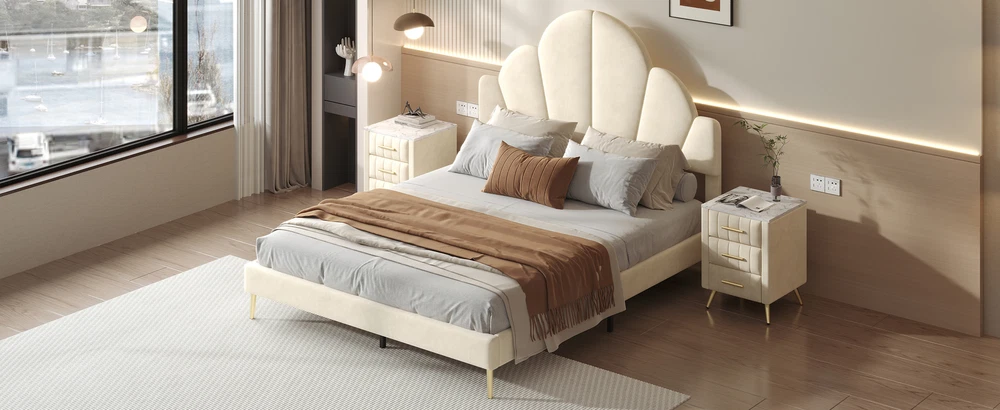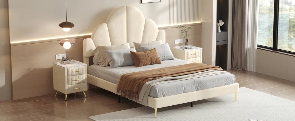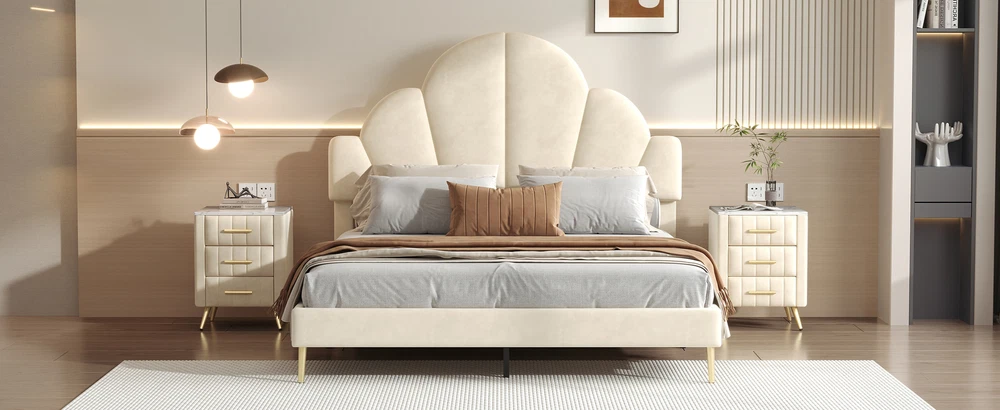 Brand Unbranded Item Length 62.25 Item Width 16.00 Item Height 8.25 Color Beige Frame Material Velvet Type BED FRAME Compatible Mattress Size As described Diamond-ring-1 Simple life Queen Size Upholstered Bed Frame with Elegant Design, Modern Velvet Platform Bed with Petal Shape Headboard,Beige Elegant Design: This queen-size upholstered bed frame is a perfect blend of luxury and sophistication, featuring a high-quality velvet finish that adds a warm, inviting touch to any bedroom. Its design is both modern and timeless, enhancing the ambiance of the room with elegance. Petal-Inspired Headboard: The standout feature of this bed is its unique, petal-shaped headboard. This distinctive shape gives the bed a soft, artistic feel, serving as a beautiful centerpiece for your bedroom. The petal design brings an organic, natural flow to the room, while maintaining a chic and modern look. Premium Velvet Upholstery: Crafted with soft, premium velvet fabric, this bed frame not only looks luxurious but also provides a smooth, comfortable feel. The upholstery is not only visually appealing but also durable, designed to maintain its luster and beauty over time. Solid and Sturdy Platform Base: Built with a strong, durable platform base, this bed frame provides excellent support and stability. It’s designed to be used without a box spring, which allows for a lower, streamlined profile that is both stylish and practical, offering long-term comfort and ease. Overall Dimension: 83.1 x 61.7 x 54.5 inches (L x W x H) . Suitable for mattress Queen size(Mattress is not included) Queen Size Upholstered Bed Frame with Elegant Design, Modern Velvet Platform Bed Transform your bedroom into a luxurious retreat with this queen-size upholstered bed frame, featuring a modern and elegant design. The bed is covered in soft, high-quality velvet, providing a plush and inviting feel. The standout feature is the petal-shaped headboard, which adds a unique touch of sophistication and charm, making it the perfect centerpiece for any contemporary space. With a sturdy platform construction, this bed frame offers excellent support and durability for a restful night’s sleep. Ideal for those seeking a stylish and comfortable upgrade, this bed frame effortlessly combines beauty and function. Features: Product Type Bed Color Beige Material MDF+Plywood+Velvet+Metal Size Queen Detail Product Dimension Please refer to the Size image Weight Capacity 500LBS Number of Slats 10 Recommended Mattress Thickness 8"-10" Assembly Required Yes Country of Origin China Item Specifics Brand Unbranded Item Length 62.25 Item Width 16.00 Item Height 8.25 Color Beige Frame Material Velvet Type BED FRAME Compatible Mattress Size As described Payment Returns Diamond-ring-1 Simple life DESCRIPTION PAYMENT SHIPPING RETURN POLICY CONTACT US Shop Category Store Home Other Hot Item Delivery New List Item Help & Info Payment Policy Shipping Policy Return Policy FAQ About Us Queen Size Upholstered Bed Frame with Elegant Design, Modern Velvet Platform Bed with Petal Shape Headboard,Beige Elegant Design: This queen-size upholstered bed frame is a perfect blend of luxury and sophistication, featuring a high-quality velvet finish that adds a warm, inviting touch to any bedroom. Its design is both modern and timeless, enhancing the ambiance of the room with elegance. Petal-Inspired Headboard: The standout feature of this bed is its unique, petal-shaped headboard. This distinctive shape gives the bed a soft, artistic feel, serving as a beautiful centerpiece for your bedroom. The petal design brings an organic, natural flow to the room, while maintaining a chic and modern look. Premium Velvet Upholstery: Crafted with soft, premium velvet fabric, this bed frame not only looks luxurious but also provides a smooth, comfortable feel. The upholstery is not only visually appealing but also durable, designed to maintain its luster and beauty over time. Solid and Sturdy Platform Base: Built with a strong, durable platform base, this bed frame provides excellent support and stability. It’s designed to be used without a box spring, which allows for a lower, streamlined profile that is both stylish and practical, offering long-term comfort and ease. Overall Dimension: 83.1 x 61.7 x 54.5 inches (L x W x H) . Suitable for mattress Queen size(Mattress is not included) Queen Size Upholstered Bed Frame with Elegant Design, Modern Velvet Platform Bed Transform your bedroom into a luxurious retreat with this queen-size upholstered bed frame, featuring a modern and elegant design. The bed is covered in soft, high-quality velvet, providing a plush and inviting feel. The standout feature is the petal-shaped headboard, which adds a unique touch of sophistication and charm, making it the perfect centerpiece for any contemporary space. With a sturdy platform construction, this bed frame offers excellent support and durability for a restful night’s sleep. Ideal for those seeking a stylish and comfortable upgrade, this bed frame effortlessly combines beauty and function. Features: Product Type Bed Color Beige Material MDF+Plywood+Velvet+Metal Size Queen Detail Product Dimension Please refer to the Size image Weight Capacity 500LBS Number of Slats 10 Recommended Mattress Thickness 8"-10" Assembly Required Yes Country of Origin China Item Specifics Brand : Unbranded Item Length : 62.25 Item Width : 16.00 Item Height : 8.25 Color : Beige Frame Material : Velvet Type : BED FRAME Compatible Mattress Size : As described Payment Returns All rights reserved.