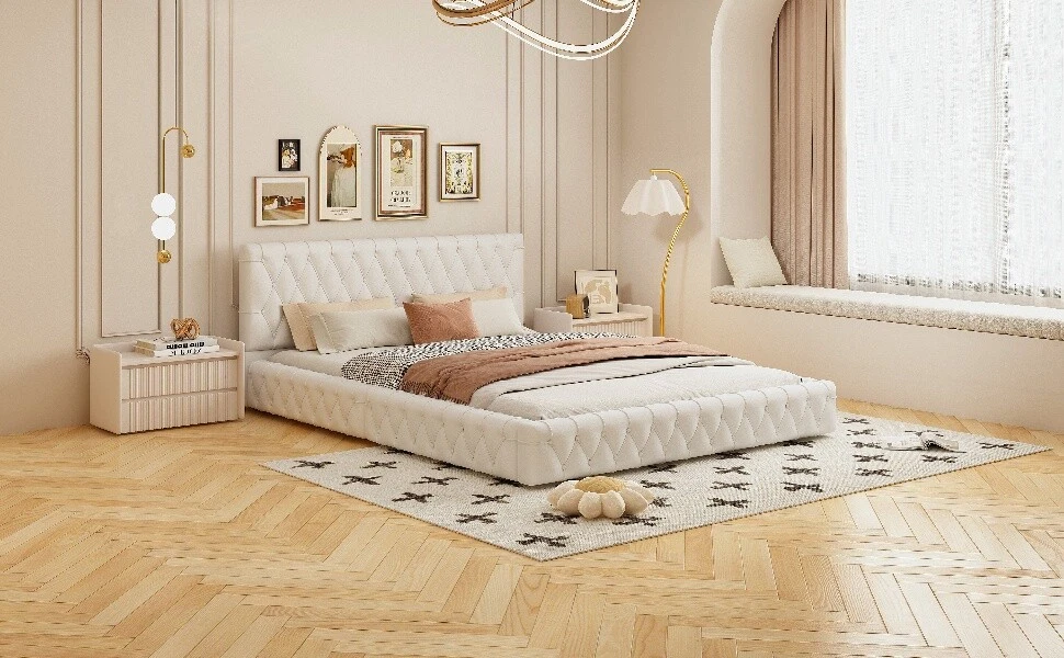Brand Unbranded Item Length 66.93 Item Width 9.65 Item Height 4.92 Color White Frame Material Solid Wood MDF Type BED FRAME Compatible Mattress Size As described Diamond-ring-1 Simple life Queen Size Upholstered Bed with Tufted Headboard, Modern Velvet Platform Bed , No Box Spring Required, White Modern Comfort Design: The entirety of this bed is wrapped in velvet fabric, making the bed look elegant and luxurious as a whole. Firm and Reliable:Entire bed is made of MDF and solid wood, which is strong, reliable and durable to guard your peaceful sleep for a long time. Full of Security Sleep Environment: The head of the bed and the bed are surrounded by foam padding, so that you can approach the bed from any angle to minimize the bump, the bed slats is built into the bed, so that your mattress can be firmly fixed in the bed, to avoid the mattress movement to bring you sleep discomfort. No Spring Box Required:No box spring needed, 10 solid wood bed slats with 650 lbs weight capacity, you can place your mattress directly on the bed frame, you don't need to buy extra box spring, super cost-effective. Bed Size and Hassle Free Assembly :86.6"L*64.6"W*31.1"H.Detailed instructions and complete installation materials make it easy to set up this bed. Queen Size Upholstered Bed with tufted headboard, Modern Velvet Platform Bed, White The entirety of this bed is wrapped in a spongy velvet fabric that is cozy and soft. The tufted design gives the bed an overall luxurious look.Sturdy overall construction protects your sleep.With bed wood slats, you don't need to buy a box spring, which is a great value for your money. Come and own this beautiful and elegant bed! Features: Product Type Bed Color White Product Material MDF+Solid Wood+Velvet Size Queen Number of Slats 10 Detail Product Dimension Please refer to the size image Weight Capacity 650LBS Recommended Mattress Thickness 8"-10" Assembly Required Yes Country of Origin Malaysia Item Specifics Brand Unbranded Item Length 66.93 Item Width 9.65 Item Height 4.92 Color White Frame Material Solid Wood MDF Type BED FRAME Compatible Mattress Size As described Payment Returns Diamond-ring-1 Simple life DESCRIPTION PAYMENT SHIPPING RETURN POLICY CONTACT US Shop Category Store Home Other Hot Item Delivery New List Item Help & Info Payment Policy Shipping Policy Return Policy FAQ About Us Queen Size Upholstered Bed with Tufted Headboard, Modern Velvet Platform Bed , No Box Spring Required, White Modern Comfort Design: The entirety of this bed is wrapped in velvet fabric, making the bed look elegant and luxurious as a whole. Firm and Reliable:Entire bed is made of MDF and solid wood, which is strong, reliable and durable to guard your peaceful sleep for a long time. Full of Security Sleep Environment: The head of the bed and the bed are surrounded by foam padding, so that you can approach the bed from any angle to minimize the bump, the bed slats is built into the bed, so that your mattress can be firmly fixed in the bed, to avoid the mattress movement to bring you sleep discomfort. No Spring Box Required:No box spring needed, 10 solid wood bed slats with 650 lbs weight capacity, you can place your mattress directly on the bed frame, you don't need to buy extra box spring, super cost-effective. Bed Size and Hassle Free Assembly :86.6"L*64.6"W*31.1"H.Detailed instructions and complete installation materials make it easy to set up this bed. Queen Size Upholstered Bed with tufted headboard, Modern Velvet Platform Bed, White The entirety of this bed is wrapped in a spongy velvet fabric that is cozy and soft. The tufted design gives the bed an overall luxurious look.Sturdy overall construction protects your sleep.With bed wood slats, you don't need to buy a box spring, which is a great value for your money. Come and own this beautiful and elegant bed! Features: Product Type Bed Color White Product Material MDF+Solid Wood+Velvet Size Queen Number of Slats 10 Detail Product Dimension Please refer to the size image Weight Capacity 650LBS Recommended Mattress Thickness 8"-10" Assembly Required Yes Country of Origin Malaysia Item Specifics Brand : Unbranded Item Length : 66.93 Item Width : 9.65 Item Height : 4.92 Color : White Frame Material : Solid Wood MDF Type : BED FRAME Compatible Mattress Size : As described Payment Returns All rights reserved.