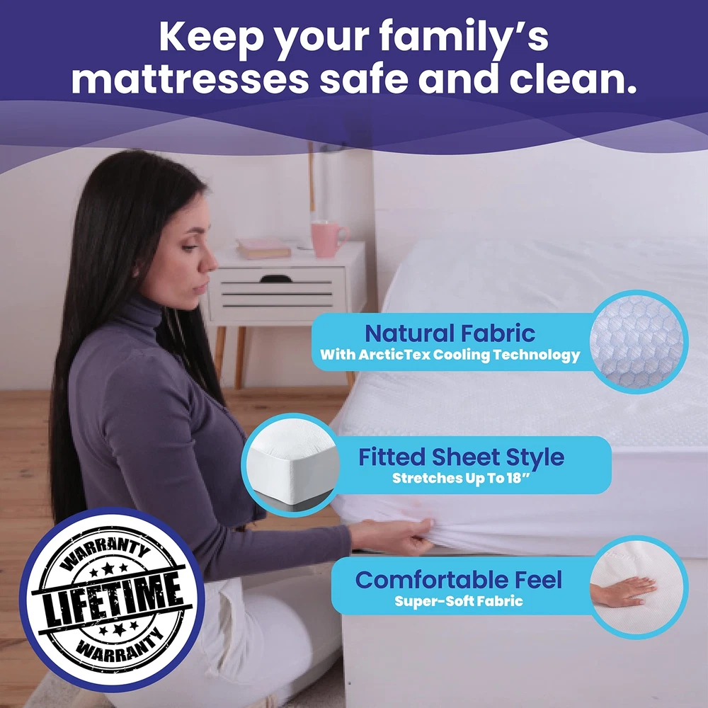 COOLING MATTRESS PROTECTOR has developed developed a hypoallergenic Cooling Mattress Protector, using ArcticTex Cooling Technology to pull heat away from the body and create the perfect sleeping environment. The high-end fabric cools as body temperatures change during the night, for a comfortable sleep all night long. WATERPROOF MATTRESS PROTECTOR Let’s face it, life happens! Spills, dirt and other liquids can sometimes fall on our bed. But thanks to the innovative micro-coating under the protector’s top layer, they won’t get in your mattress. Our hypoallergenic mattress cover is completely silent, with none of the crinkling sounds you get with a typical mattress protector. Enjoy a sleep experience you simply cannot get anywhere else. HYPOALLERGENIC MATTRESS PROTECTOR 's dust resistant Mattress Protector is tightly woven to ensure that dirt and dust cannot penetrate the mighty (but soft) barrier. Using a unique breathable weave, our hypoallergenic mattress cover is designed to repel dirt, dust and other harmful allergens so you sleep well and your mattress stays fresh and clean. Less dust in your mattress equals a better night’s sleep, every time! FEATURES & BENEFITS ’s allergen blocking Mattress Protector is a fitted sheet style, with ultra-flexible pockets that stretch to fit mattresses up to 18” deep. Cooling Mattress Protector is available in the following sizes: Twin, Twin XL, Full, Queen, King and Cal King. LIFETIME WARRANTY At , we strive to provide a clean, healthy and comfortable sleep environment. We believe a healthy family starts with a healthy sleep. pledges to help you keep your family’s mattresses safe and protected for a wonderful night’s sleep filled with sweet dreams. We’re so sure you’ll love our products, we offer a Lifetime Warranty!