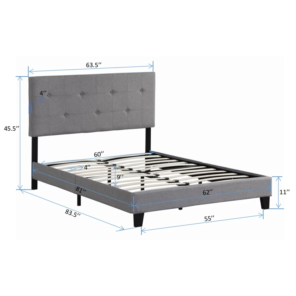 Specifications Place of Origin #originPlace# Main Color Gray Main Material Linen Dangerous Goods #dangerFlag# Dimensions & Weights Assembled Length (in.) 83.50 Assembled Width (in.) 63.50 Assembled Height (in.) 45.50 Weight (lbs) 73.70 Product Features Modern style and comfort to any bedroom Easy Assembly:The package includes clear instruction,all parts and tools,very easy to assemble Mattress frame comes in queen (Mattress No included) No box spring needed:This bed frame no box spring needed, can be used with all mattress types This bed will be matched 8 inch thickness or more mattress Note: The other parts are placed in a non-woven cloth behind the head of the bed Weight Limit: 500 LBS 1 set of bed in 1 carton Description