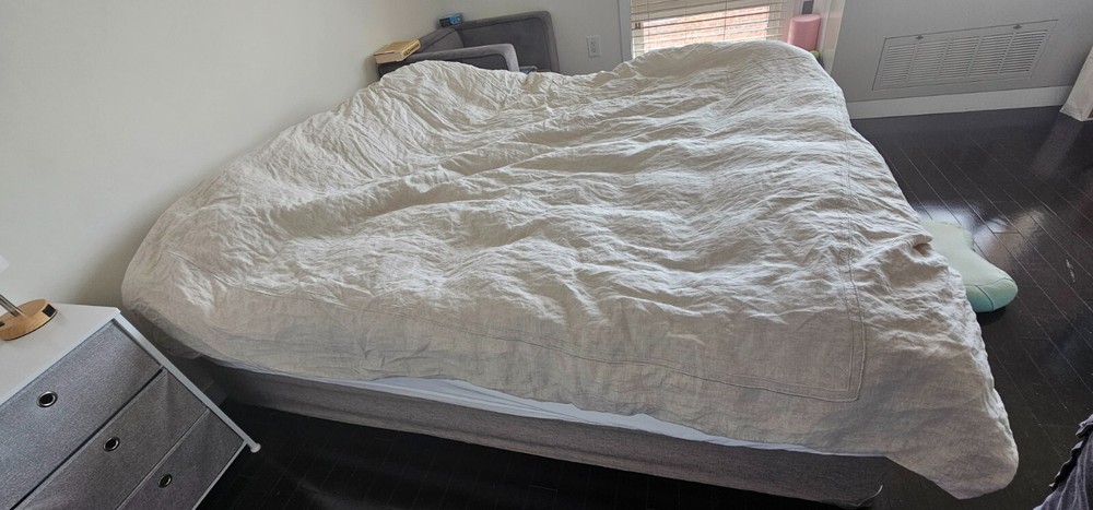 The product is a Queen sized bed frame made of wood in a gray color, suitable for adults in a bedroom setting. It is designed to hold a Queen sized mattress, providing a comfortable sleeping area for two adults. The wooden frame adds a touch of elegance to the bedroom decor and can support a heavy mattress and occupant without compromising on stability or durability. Perfect for creating a cozy and inviting atmosphere in a bedroom.
