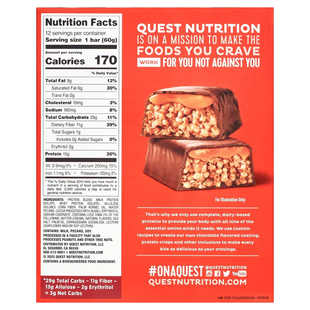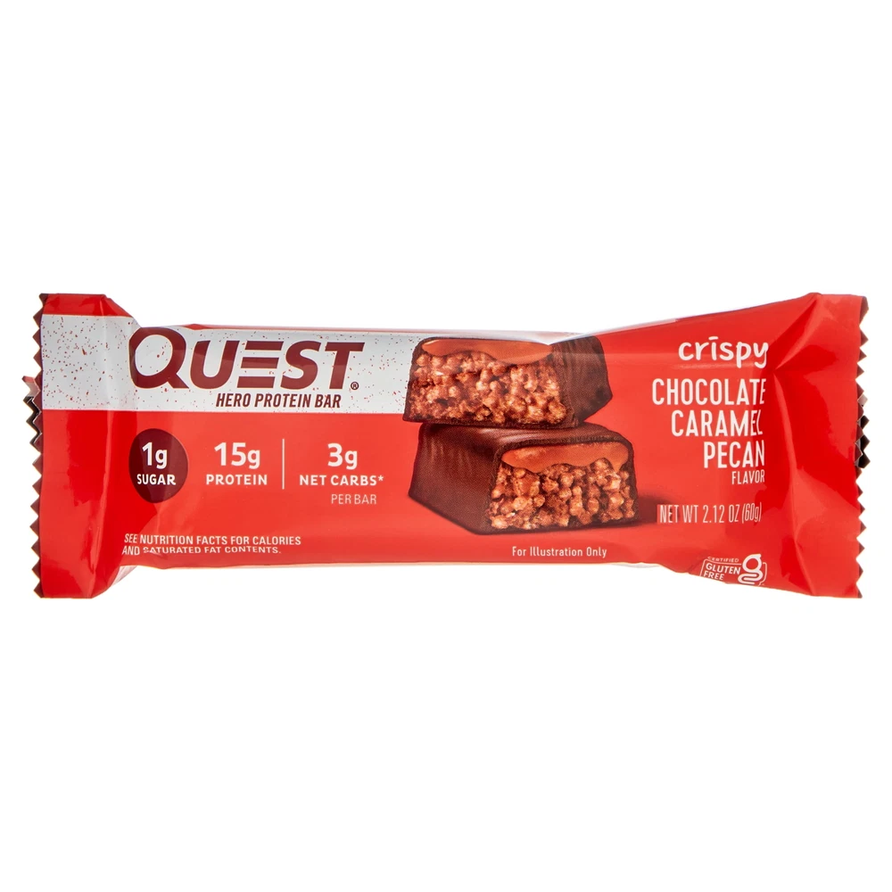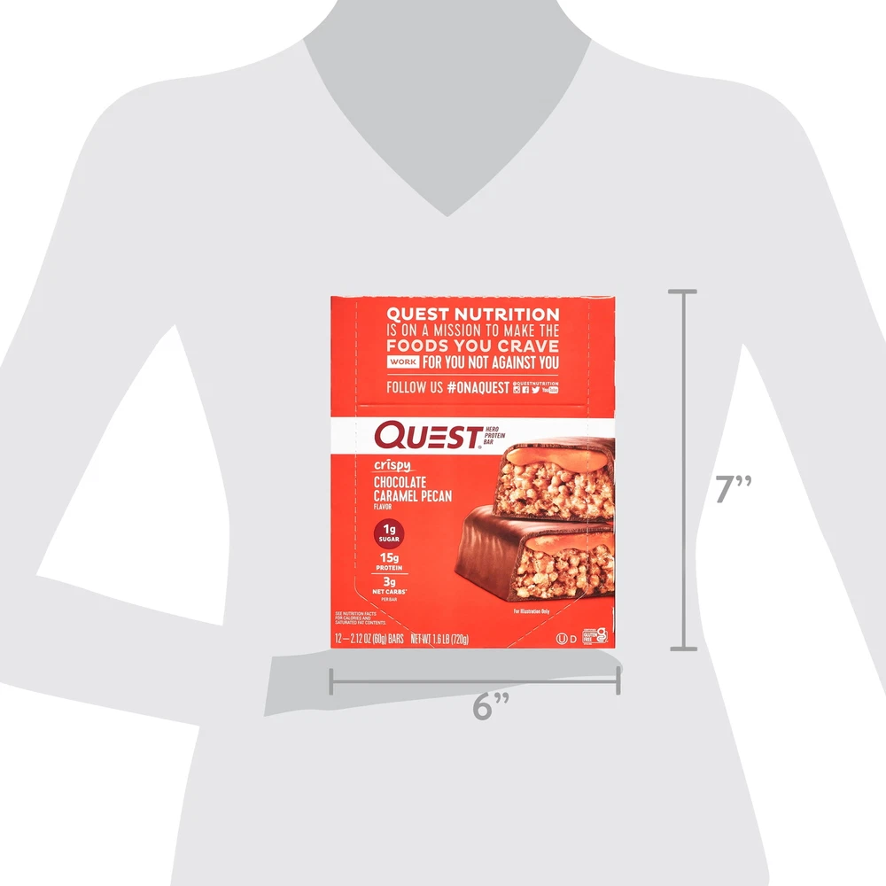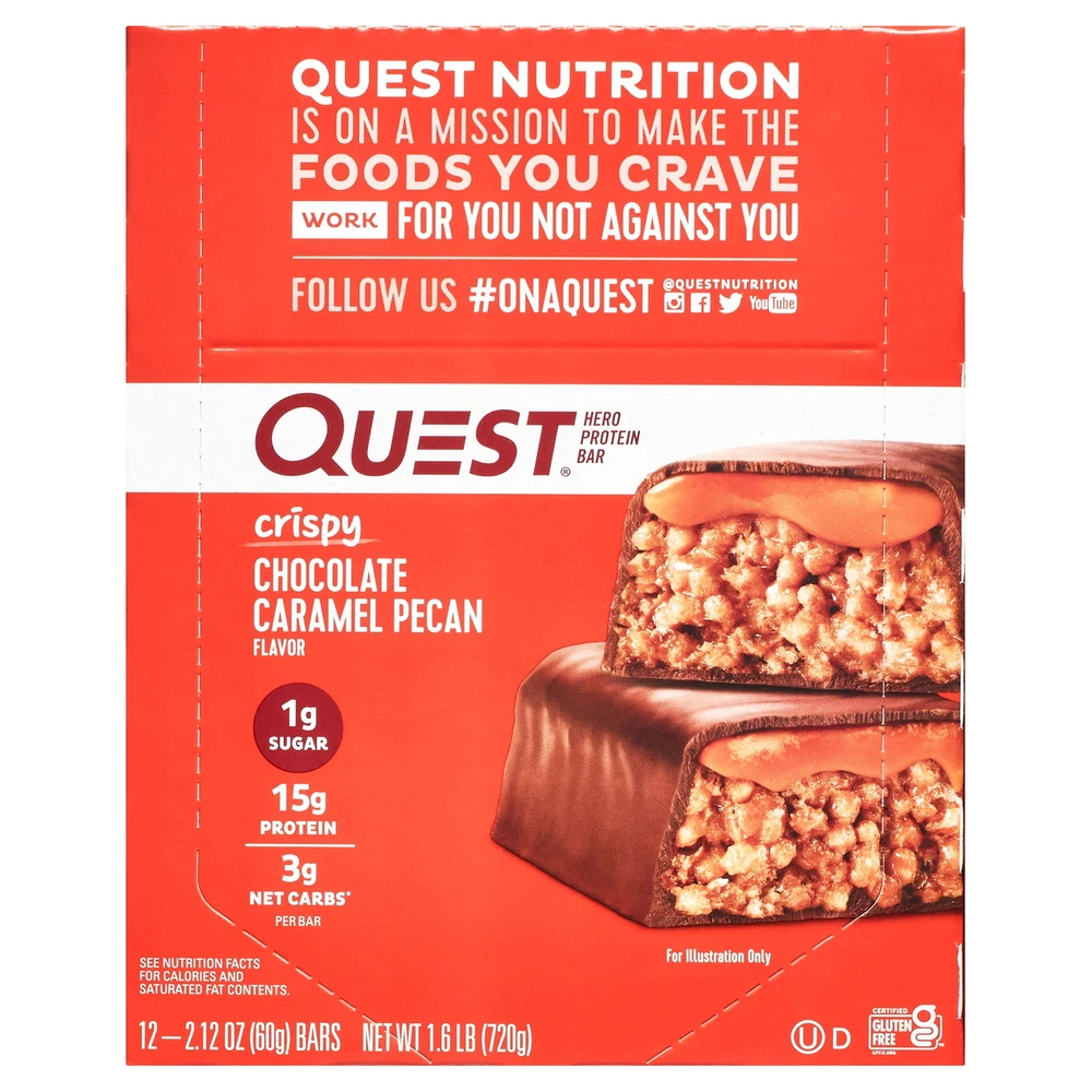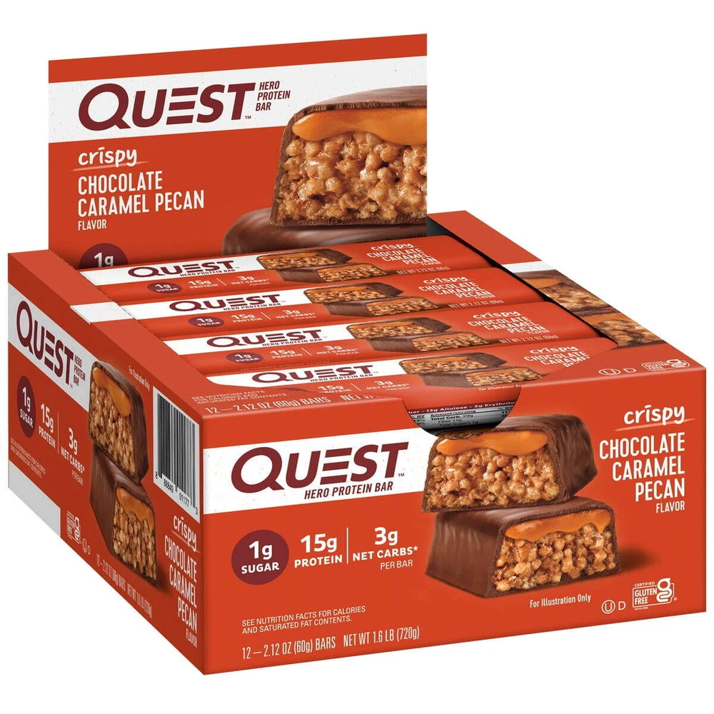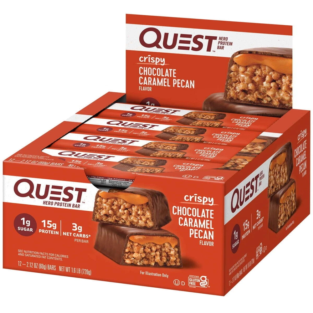 eBay Product details Quest™ Hero Protein Bars offer a sweet, airy, and crispy indulgent treat with 1 gram of sugar per serving. Our Hero protein bars, coated on the outside and crispy and chewy on the inside, are the perfect sweet without all the bad stuff. Enrobed in a decadent chocolate-flavored coating and packed with a light and crispy texture, they're topped with a sweet, gooey caramel filling and sprinkled with real pecans. Quest Hero Bars are low-carb, gluten-free, and high-protein, making them a great option for school lunch snacks, a quick breakfast option, an on-the-go treat, or a post-workout snack. Due to global supply chain issues, Quest™ recently reformulated some of its products to contain soy lecithin and/or vegetable oil, including soybean, which is considered an allergen. The small amount contained within the product will not change the quality, flavor, or texture of the product. We remain committed to using high-quality dairy-based proteins to help give you the amino acids you need. YOU DESERVE A SWEET TREAT: The Quest Crispy Chocolate Caramel Pecan Hero Protein Bar tastes like a sweet, indulgent dessert. Only our bar has 16g protein, 4g net carbs and 1g of sugar UNWRAP COMPLETE PROTEINS: The Quest Crispy Chocolate Caramel Pecan Hero Protein Bar are made with complete, dairy-based proteins to provide your body with 9 essential amino acids FIBER IS YOUR FRIEND: The Quest Crispy Chocolate Caramel Pecan Hero Protein Bars have 11g of fiber to provide your body with a more complete macro profile SWEET WITHOUT ALL THE SUGAR: Enjoy the sweet taste of Chocolate and caramel with pecans without worrying about excess sugar. The Quest Crispy Chocolate Caramel Pecan Hero Protein Bar has 1g of sugar TREATS THAT TRAVEL WITH YOU: Take Quest Crispy Chocolate Caramel Pecan Hero Protein Bars with you in your backpack, purse, car console, cup holder, gym bag or wherever your adventures take you Box contains 12 Crispy Chocolate Caramel Pecan flavored Quest Hero Protein Bars