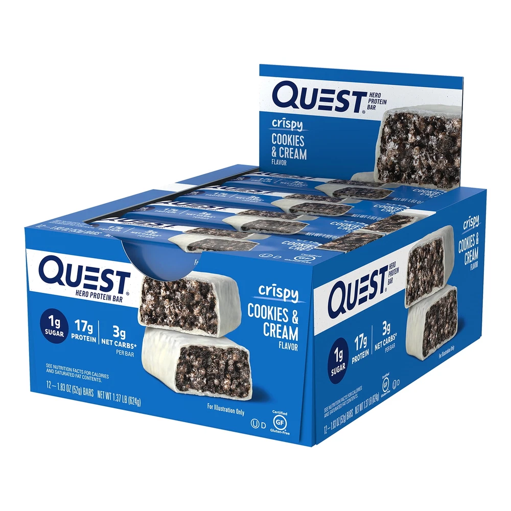 Quest Nutrition is on a mission to make the foods you crave work for you, not against you. That’s why the Quest Cookies & Cream Hero Protein Bar has 17g protein, 1g sugar and 3g net carbs per bar. Discover sweets without all the sugar and enjoy the benefits of feeding your cravings the Quest way. Why do millions of people love Quest Protein Bars? Quest Protein Bars are sweet without all the sugar. Our bars use complete, dairy-based proteins and provide 9 essential amino acids to help, support and uplift your nutrition goals without sacrificing taste. Quest Hero Bars look and taste like the candy bars you know and love with a fraction of the sugars and net carbs. Sounds too good to be true? Contains 4 individually wrapped protein bars. Due to global supply chain issues, Quest recently reformulated some of its products to contain soy lecithin and/or vegetable oil including soybean which is considered an allergen. The small amount contained within the product will not change the quality, flavor or texture of the product. We remain committed to using the high quality dairy-based proteins to help give you the amino acids you need. YOU DESERVE A SWEET TREAT: The Quest Cookies & Cream Hero Protein Bar tastes like an indulgent candy bar. Only our version has 17g protein, 3g net carbs and 1g of sugar. UNWRAP COMPLETE PROTEINS: The Quest Cookies & Cream Hero Protein Bars are made with complete, dairy-based proteins to provide your body with 9 essential amino acids. FIBER IS YOUR FRIEND: The Quest Cookies & Cream Hero Protein Bars have 6g of fiber to provide your body with a more complete macro profile. SWEET WITHOUT ALL THE SUGAR: Enjoy the sweet taste of Cookies & Cream without worrying about excess sugar. The Quest Cookies & Cream Hero Protein Bar has 1g of sugar per bar. COMFORT FOODS FOR ANYTIME CRAVINGS: The Quest Cookies & Cream Hero Protein Bar is a sweet treat, without all the sugar, you can enjoy whenever you want to satisfy your sweet cravings. Box contains 12 Cookies & Cream flavored Quest Hero Protein Bars