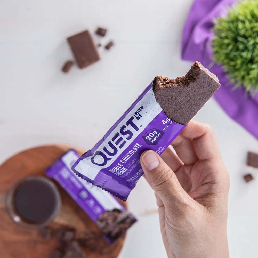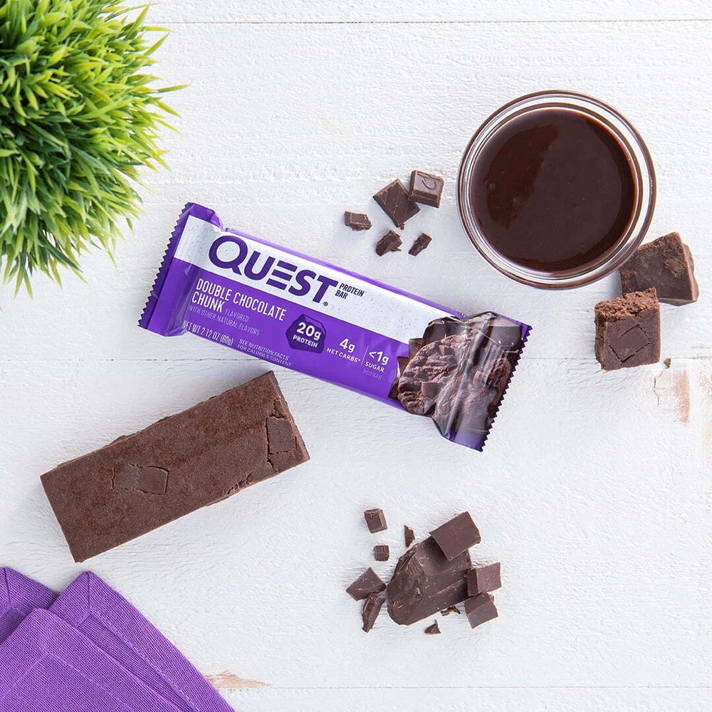 Product details QuestBar Protein Bar - Double Chocolate Chunk 20g Protein Less than 1g Sugar 13g Fiber Gluten Free 23g Carbs - 13g Fiber - 6g Erythritol = 4g Net Carbs Quest is the first bar you can eat guilt free! To bring you a bar this healthy and tasty, we had to create a whole new process for making bars. Quest is so revolutionary, in fact, that we've filed a patent! That's why you won't see any other bar like it on the market. Quest is the first truly low carb bar that doesn't contain glycerin, simple carbs, sugars or artificial sweeteners. Quest Bars are the only bars that you can eat without feeling guilty! High in Fiber & Protein Gluten Free & Kosher 20g Protein, 4g Net Carbs, & 1g Sugar