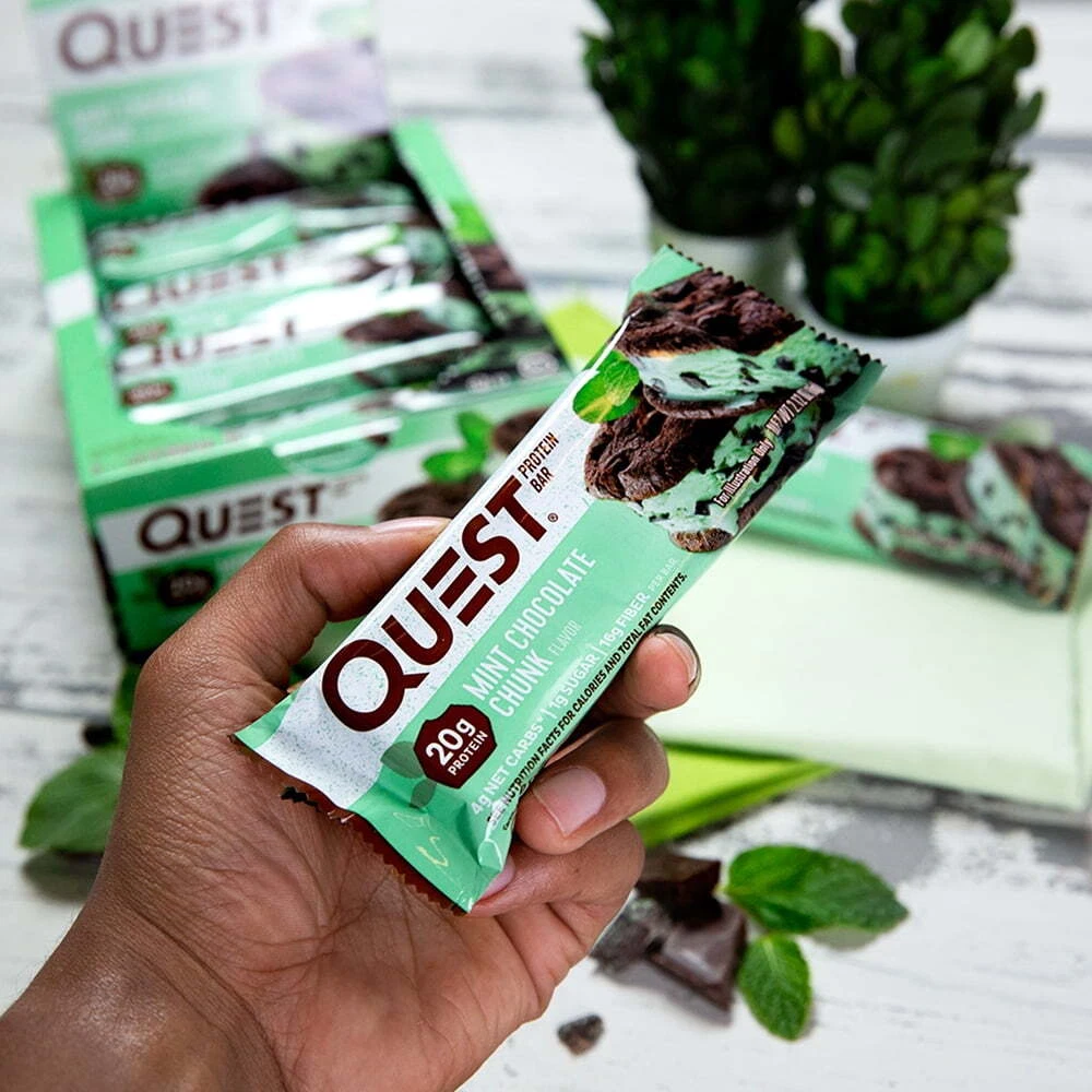 eBay Product details A sweet and refreshingly indulgent chocolate bar packed with mint flavored chunks with 20g of protein and 1g of sugar. YOU DESERVE A SPECIAL TREAT: The Mint Chocolate Chunk Protein Bars taste like an indulgent chocolate mint patty. Only our bar has 20g protein, 4g net carbs and 1g of sugar per bar. UNWRAP COMPLETE PROTEINS: The Quest Mint Chocolate Chunk Protein Bars are made with complete, dairy-based proteins to provide your body with 9 essential amino acids. FIBER IS YOUR FRIEND: The Quest Mint Chocolate Chunk Protein Bars have 16g of fiber to provide your body with a more complete macro profile. SWEET WITHOUT ADDED SUGAR: Enjoy the refreshingly sweet taste of chocolate and mint without worrying about added sugars. The Quest Mint Chocolate Chunk Protein Bar has no added sugars. COMFORT FOODS FOR ANYTIME CRAVINGS: The Quest Mint Chocolate Chunk Protein Bar is a sweet treat, without all the sugar, you can enjoy whenever you want to satisfy your sweet tooth Box contains 12 Mint Chocolate Chunk flavored Quest Protein Bars