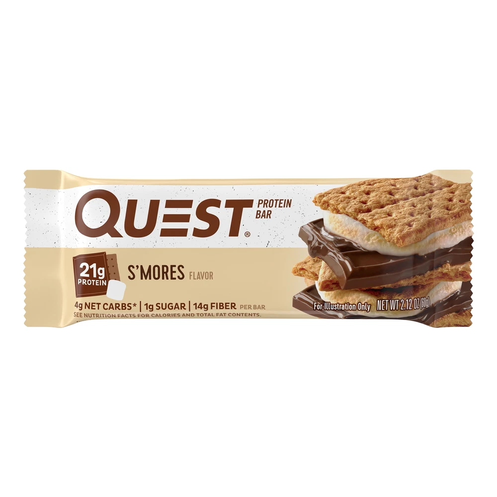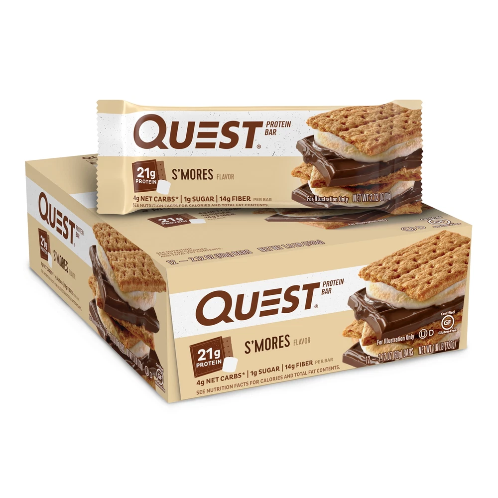 Product details The campfire classic flavor of graham crackers, chocolate and marshmallows in a chewy protein bar with 21g of protein and 1g of sugar. YOU DESERVE A SPECIAL TREAT: The Quest S’mores Protein Bars taste like your favorite treat to make around the campfire. Only our version has 21g protein, 4g net carbs and 1g of sugar per bar. UNWRAP COMPLETE PROTEINS: The Quest S’mores Protein Bars are made with complete, dairy-based proteins to provide your body with 9 essential amino acids. FIBER IS YOUR FRIEND: The Quest S’mores Protein Bars have 14g of fiber to provide your body with a more complete macro profile. SWEET WITHOUT ADDED SUGAR: Enjoy the sweet taste of S’mores without worrying about added sugars. The Quest S’mores Protein Bar has no added sugars. COMFORT FOODS FOR ANYTIME CRAVINGS: The Quest S'mores Protein Bar is a sweet treat, without all the sugar, you can enjoy whenever you want to satisfy your sweet tooth. Box contains 12 S’mores flavored Quest Protein Bars