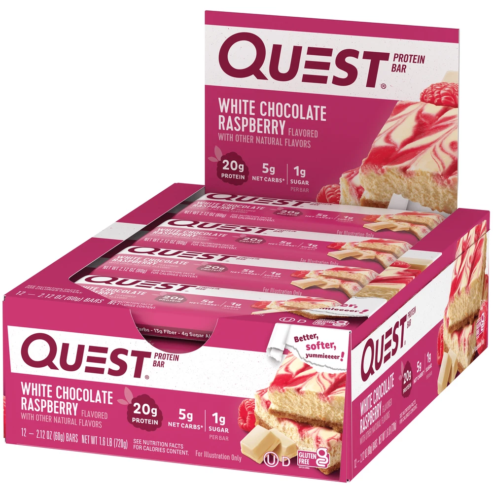 Product details The sweet taste of a raspberry tart made with real freeze-dried raspberries with 20g of protein and 1g of sugar. YOU DESERVE A SPECIAL TREAT: The Quest White Chocolate Raspberry Protein Bars taste like a raspberry tart from your favorite pastry shop. Only our version has 20g protein, 5g net carbs and 1g of sugar per bar. UNWRAP COMPLETE PROTEINS: The Quest White Chocolate Raspberry Protein Bars are made with complete, dairy-based proteins to provide your body with 9 essential amino acids. FIBER IS YOUR FRIEND: The Quest White Chocolate Raspberry Protein Bars have 15g of fiber to provide your body with a more complete macro profile. SWEET WITHOUT ADDED SUGAR: Enjoy the sweet taste of a raspberry tart without worrying about added sugars. The Quest White Chocolate Raspberry Protein Bar has no added sugars. COMFORT FOODS FOR ANYTIME CRAVINGS: The Quest White Chocolate Raspberry Protein Bar is a sweet treat, without all the sugar, you can enjoy whenever you want to satisfy your sweet tooth. Box contains 12 White Chocolate Raspberry flavored Quest Protein Bars