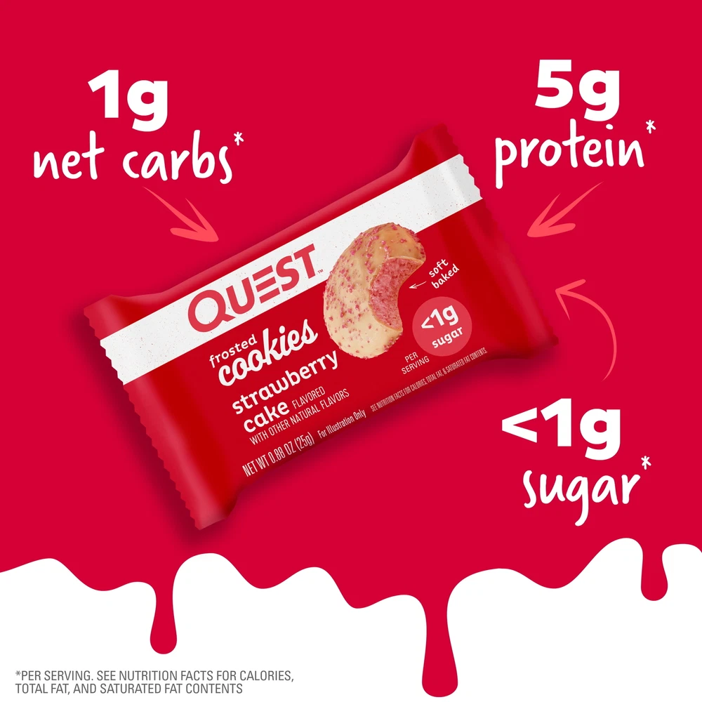 Quest Strawberry Cake Frosted Cookies feature a sweet coating around a soft-baked fruit flavored center. Quest Frosted Cookies provide the sweet satisfaction of a sugary bakery cookie with less than 1g of sugar, 5g of protein, and 1g of net carbs per serving*. Sounds too good to be true? Taste them Quest frosted cookies for yourself! Perfect for an on the go dessert treat, shareable celebration, or anytime the cravings hit for a soft and chewy frosted strawberry cookie. FROSTED COOKIES. Enjoy the berry yummy flavor of Strawberry Cake in this soft baked, fruit flavored cookie enrobed in a sweet frosted coating with less than 1g of sugar, 5g of protein, and 1g of net carbs per serving*. ON A QUEST. Our soft & chewy frosted cookies are just the right amount of sweet to keep you satisfied when it’s snack time, making them a great low sugar*, low carb* protein snack. ON THE MOVE. Enjoy a sweet & satisfying cookie that fits right into your busy schedule. Hint: This protein cookie makes for an enjoyable afternoon snack or late night low carb* snack! QUALITY INGREDIENTS: Delight in the satisfying flavors and nutrients of Quest Frosted Cookies made with quality ingredients. SERVING SIZE: Offered in 8ct cartons containing individually wrapped 0.88oz cookies. ALL TASTE. NO COMPROMISE. Give your body the nutrients it needs without sacrificing your favorite flavors. Our cookies have all the sweetness you want in a snack without compromise.*See Nutrition Facts for Calories, Total Fat and Saturated Fat Contents. Total Carbohydrates, 1g Net Carbs per serving. (Net carbs = Total Carbs - Dietary Fiber - Sugar Alcohols)