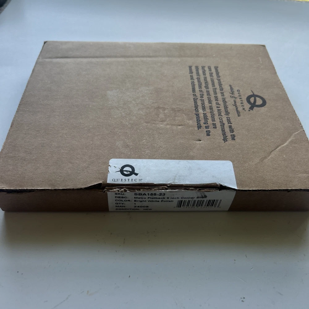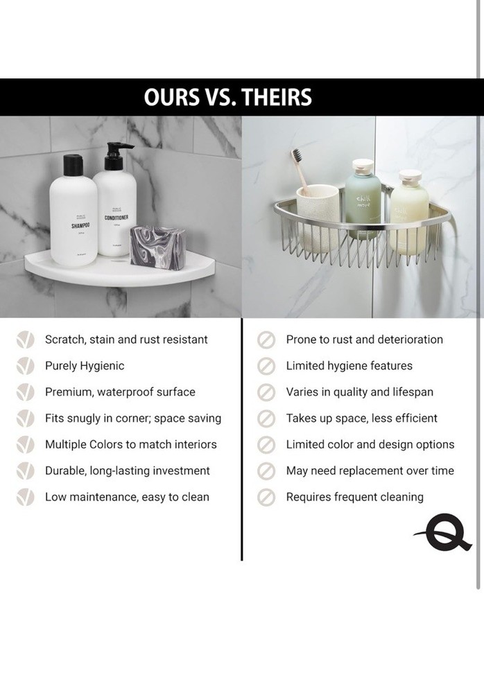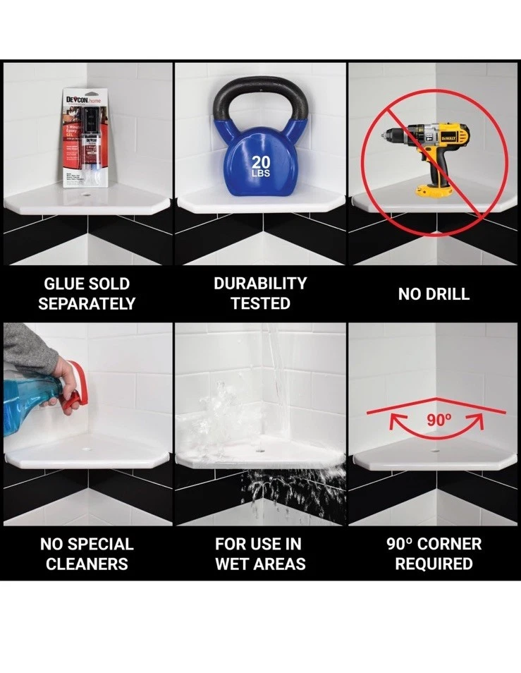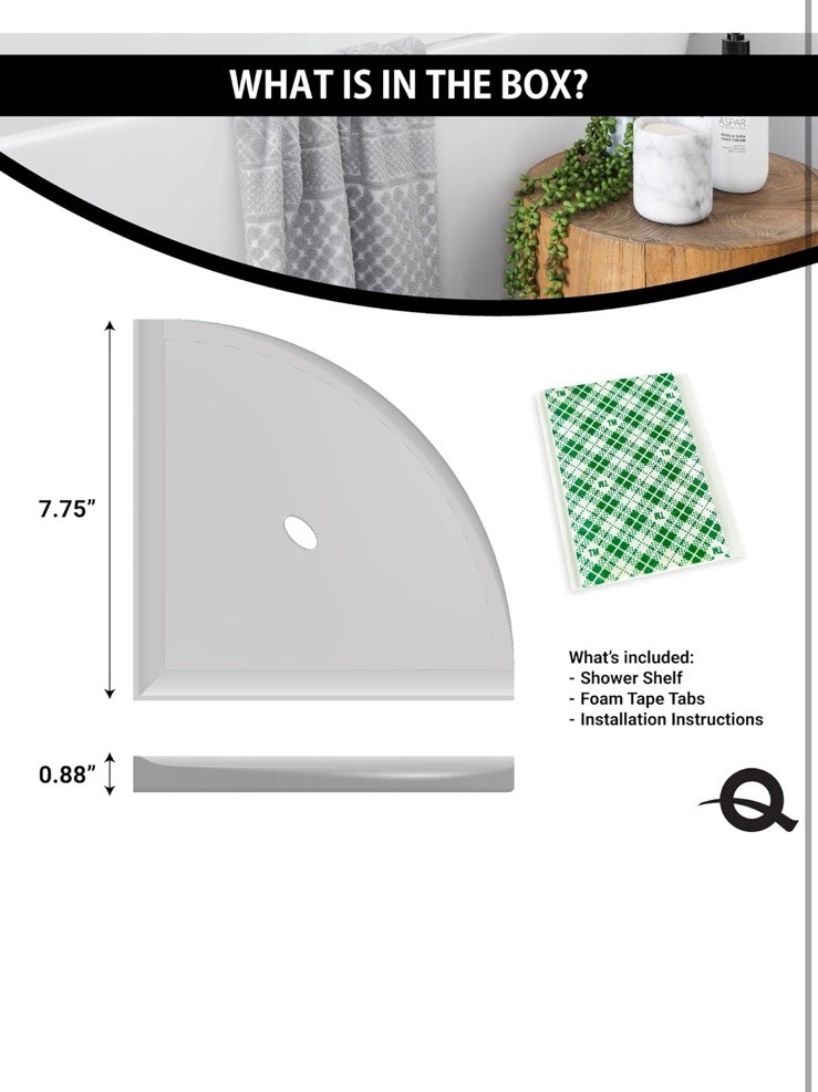 Open box New item! Adhesive Sold Separately Made in USA EASY RETROFIT INSTALLATION: Easy no-drill shower shelf installation for retrofit application over existing smooth stone and ceramic tile wall surface. Setting materials sold separately STYLE & DURABILITY: Made from premium stone and metals combined with polymers and ceramic. Sealed with Q-Seal for an easy to clean, scratch and stain resistant surface for a long lasting finish SPACE SAVING & ORGANIZED: Innovative corner shelf design helps you easily organize all of your bath essentials while matching and accenting your wall tile, hardware and lighting fixtures MADE IN USA: Questech corner shower shelves and soap dishes are handcrafted in Vermont. Some surface marks and color variations are inherent qualities of our unique manufacturing process