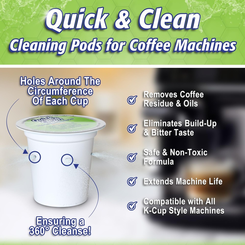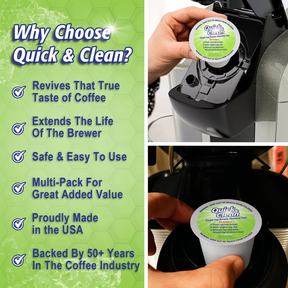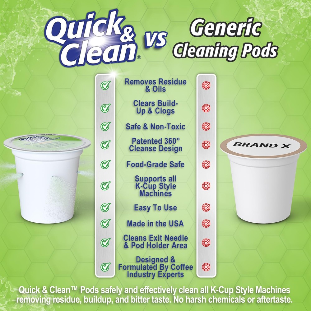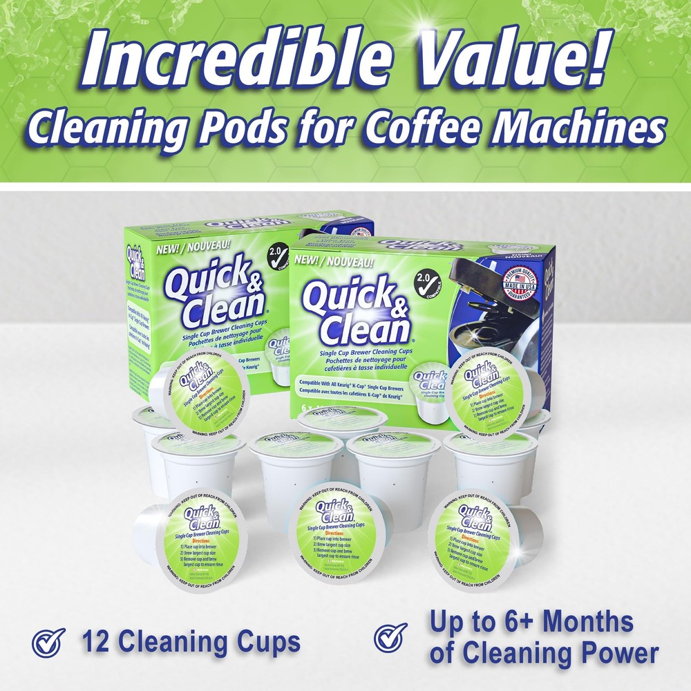 Quick & Clean [12-Pack] Keurig Cleaning Pods - K 12 Count (Pack of 1), Sage Description Features: Get That Fresh Coffee Taste Back - Over time, Keurig (TM) machines build up old grinds and residues, tainting the flavor of your coffee and espresso. Quick and Clean Keurig cleaning pods use a proprietary cleaning formula that cuts through and eliminates these residues, bringing taste back to normal Lengthens The Life Of Your Machine - Residue built up in the pack holder, funnel & exit needle can eventually cause damage to your machine. Regular cleaning using Quick & Clean's cups restores these elements and enhances the lifespan of your machine. Use in conjunction with a Keurig descaling solution for best results (not included) Safe & Easy To Use - Completely safe - non-toxic, biodegradable and gentle on your Keurig brewer (1.0 & 2.0- compatible). Easy to use - simply brew one large cycle with the k cup cleaner pod for Keurig, then one large cycle with water-only (discard liquid & keurig cleaner pod) Incredible Value - With 12 Keurig rinse pods per package and incredible cleaning effectiveness, Quick & Clean's k cup cleaner pods provide 3+ months of cleaning power (based on daily usage). No need to try using soap or non-purpose-specific cleaners on your machine. No mess, no fuss - the easy solution Please note: This is an aftermarket cleaning product (produced by Quick & Clean). We have no affiliation with or endorsement from any of the manufacturers mentioned. Use in conjunction with descaling fluid, replace filters, and use proper cartridges for best results Product Details: Handling We will ship all orders within 3 business day of payment. Delivery We Do Not Ship Outside of the Continental US. Return Policy All items qualify for returns within 30 days of receipt. Buyer is responsible for return shipping on any item that is not damaged. Feedback We take our reputation seriously, we buy and sell online, so we understand the value of trust. If you are unsatisfied with your order, please contact us and we will work with you to resolve it to your satisfaction.