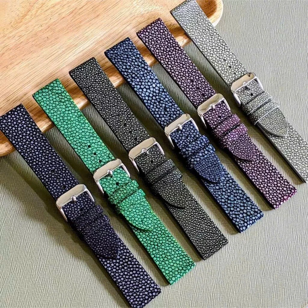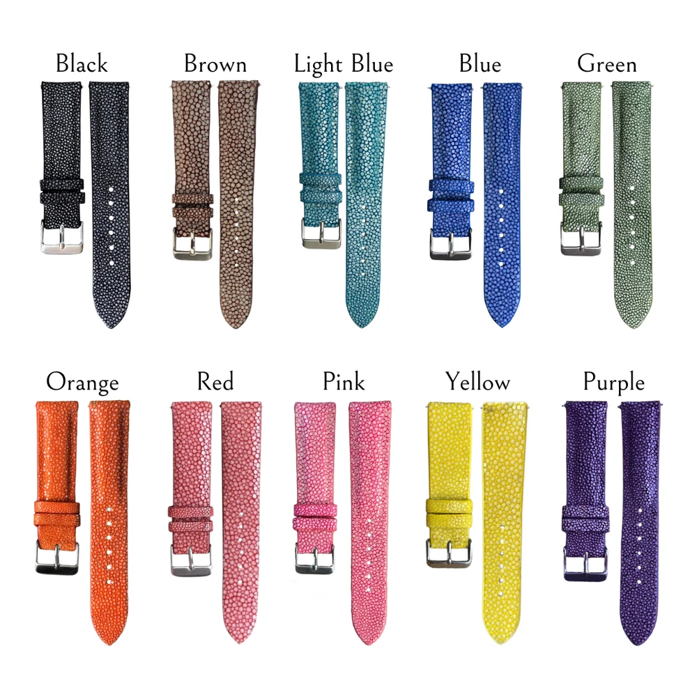 DESCRIPTION Condition: New 100% Color : Black, Brown, Light Blue, Blue, Green, Orange, Red, Pink, Yellow, Purple Surface material: Stingray skin Species : Potamotrygon scobina Inside material: Genuine Epsom leather Size: Lug/Buckle width: 24mm/22mm, 22mm/20mm, 21mm/18mm, 20mm/18mm, 19mm/16mm, 18mm/16mm, 16mm/14mm (For another size please contact us) ex: 21/19mm or 20/20mm.... Long strap length: 125mm - Short strap length: 75mm