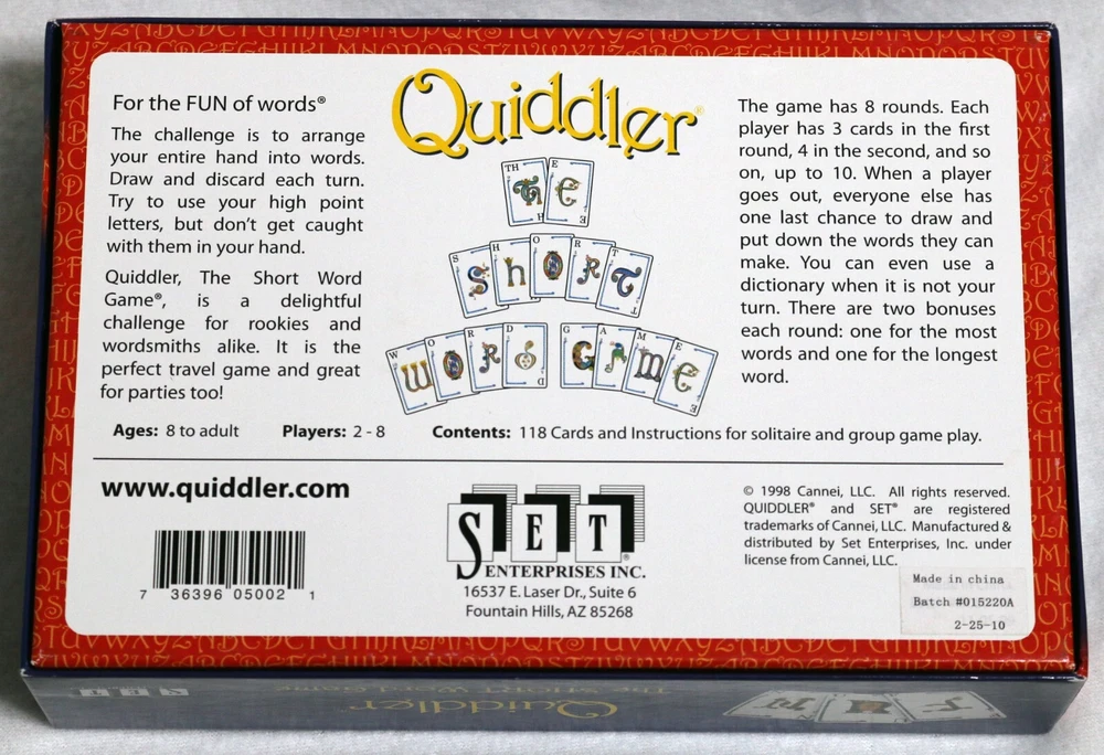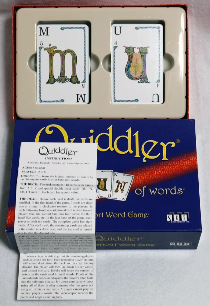 Max. Number of Players: 8 UPC: 0736396050021 Year: 1998 Theme: Strategy Country/Region of Manufacture: China Min. Number of Players: 2 players Award: Over 15 Best Game Awards Brand: Set Enterprises Gender: Boys & Girls Type: Cards MPN: 5000 Game Title: Quiddler gtin13: 0736396050021 Age Level: 8-11 Years, 12-16 Years, 17 Years & Up Features: Complete, Smoke-Free Home Recommended Age Range: 8+ Game Type: Word Game Seller Notes: “The box, cards and instructions are all in very good condition. Please see the pictures.”