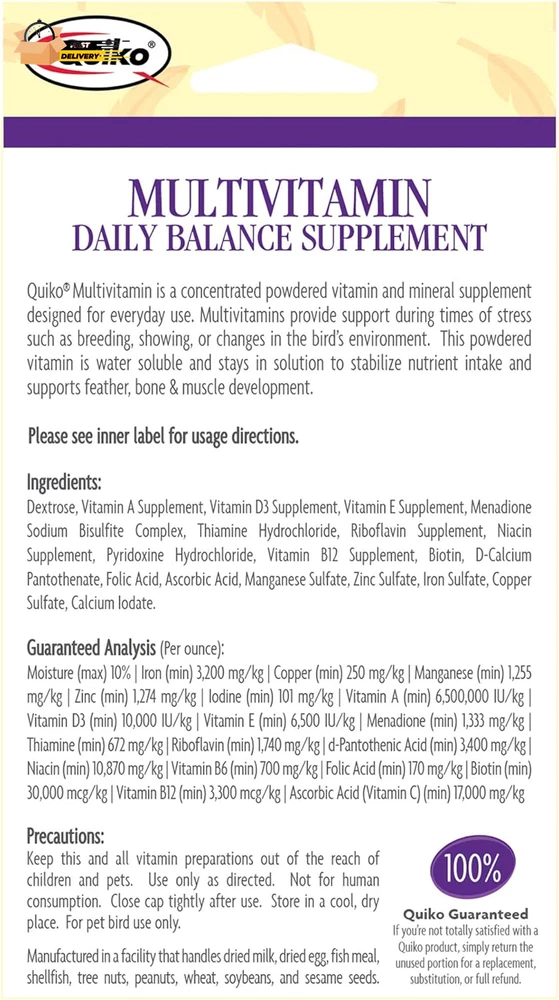 Store New Arrivals Add to Favorite View Feedback Contact Quiko Multivitamin Daily Balance Vitamin & Mineral Supplement for All Pet Birds Description Item model number 20013 Manufacturer recommended age 1 month and up Item Dimensions LxWxH 1.75 x 3 x 5.5 inches Is Discontinued By Manufacturer No Product Dimensions 1.75 x 3 x 5.5 inches; 0.96 ounces Material cotton Country of Origin Germany Item Weight 0.06 Pounds Target Species Cockatiel Flavor Canaries Size 30 Gram Item Form Stick Item Package Dimensions L x W x H 6 x 3 x 2 inches Number of Items 1 BIRD MULTIVITAMIN: Contains 14 important vitamins and 6 essential minerals. VITAMINS AND MINERALS: Includes Vitamin A, Vitamin D3, Vitamin E, Vitamin B12, Riboflavin, and Niacin, plus Biotin, Folic Acid, Calcium, and Iron. FOR ALL BIRDS: Great for small pet birds like finches and canaries or large pet birds like parrots and macaws. WATER SOLUBLE: Powdered supplement dissolves quickly into water, making it easy to sprinkle on top of regular food or serve in a dish on its own. GREAT FOR MIXING: Getting your bird to take their vitamins can be a challenge, but this mix is particularly great sprinkled over egg food. Quiko Daily Multivitamin is the ideal all-purpose daily supplement for birds of all sizes. With 20 essential vitamins and minerals, this multivitamin keeps your pet bird healthy and strong, especially during times of growth or stress. This water soluble supplement powder is easy to add to parakeet food, parrot food, cockatiel food, budgie food, macaw food, conure food, finch food, and more. Mix with egg food for a nutritious treat that goes down easy. ABOUT US We offer the best prices around on high quality products. Our E-store includes media such as books, movies, music and games while offering electronics, toys, sporting apparel, clothing, tools, general home, garden items and more. SHIPPING We are always working hard to ensure your package arrives as soon as possible. Please understand that some factors like weather, high postal traffic, and the performance of shipping companies are outside of our control. We offer free shipping to the lower 48 states and ship within 2 business days of payment, usually sooner. We do not accept P.O. Boxes. Please provide a physical address. For shipping outside of the continental USA, we only use eBay's Global Shipping Program.The item is shipped to KY and then sent to the rest of the world. International customers are responsible for all duties and taxes. Continue to check out in order to calculate costs for shipping the item to your country. Messages regarding eBay's Global Shipping Program MUST be directed at eBay EXCLUSIVELY. RETURNS We offer a 30-Day Return Policy on items which you are not completely satisfied with. You have the option for a full-refund or an exchange of the item. No returns are available on items shipped outside of the USA. PAYMENT We accept PayPal. CONTACT US This page content is yet to come Please ad us to your favorite seller and visit again later Thank You CUSTOMER SATISFACTION We try our very best to make sure every customer is completely satisfied. If there's a problem, message us! We're happy to help. WE ACCEPT Copyright © 2021 AutoDS. | All Rights Reserved