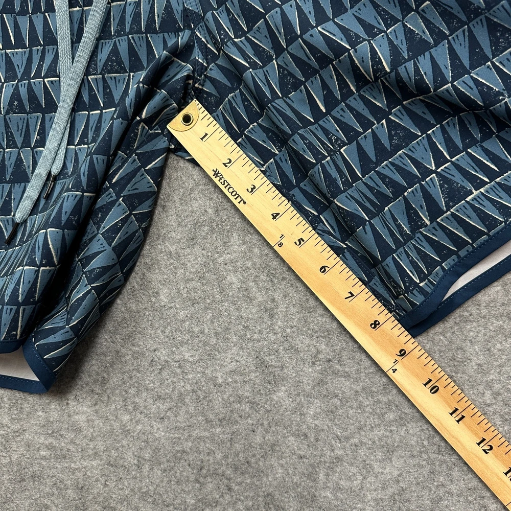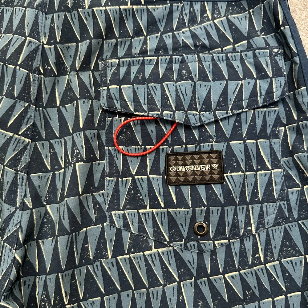 The Quiksilver Highline Boardshorts in a sail shaped geometric pattern are designed in Hawaii by surfers for surfers. Made of stretchy polyester material in a size 30 waist, these 4-way stretch board shorts offer comfort and flexibility in the water. The machine washable blended fabric ensures easy care, while the board shorts style provides a sleek silhouette for surfing performance. Featuring a hook and eye fabric strip plus laceup front closure, a back pocket with sewn in key loop, the Hawaiian islands embroidered near the Quiksilver logo, these shorts are perfect for surfers looking for functional and stylish swimwear. Made in Vietnam, these boardshorts are a must-have for any water sports enthusiast. Please review photo measurements to ensure a good fit. Ships from a smoke free home.