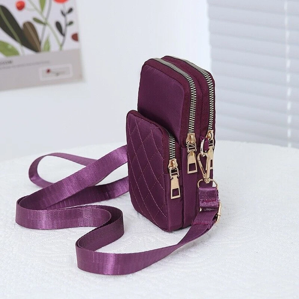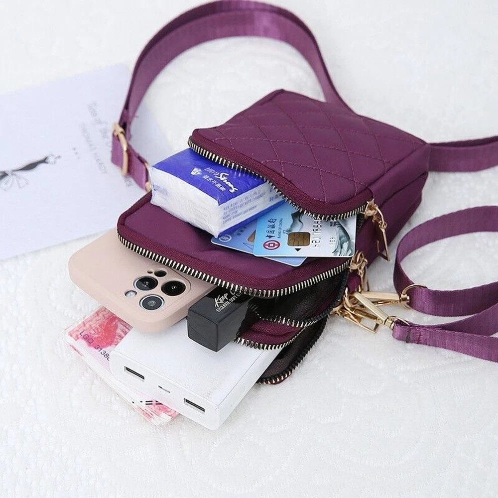 Brand: Unbranded Size: Medium Handle Style: Crossbody Strap Hardware Material: Gold-Plated Fabric Type: Woven Handle/Strap Color: Purple, Black, Blue, Grey Accessories: Detachable Strap, Key Chain, Other Strap, Wristlet Vintage: No Personalize: No Shape: Rectangle Color: Black Exterior Color: Purple, Black, Blue, Grey Lining Material: Nylon Features: Cross-Body Strap Handmade: No Occasion: Business, Casual, Party/Cocktail, Travel, Wedding, Workwear Style: Crossbody Hardware Color: Gold Department: Women Finish: Quilted Strap Drop: 23 in Country/Region of Manufacture: China Bag Height: 6 in Accents: Zipper Pattern: Argyle/Diamond Bag Width: 4 in Exterior Material: Nylon Handle/Strap Material: Nylon Bag Depth: 2 in Closure: Zip