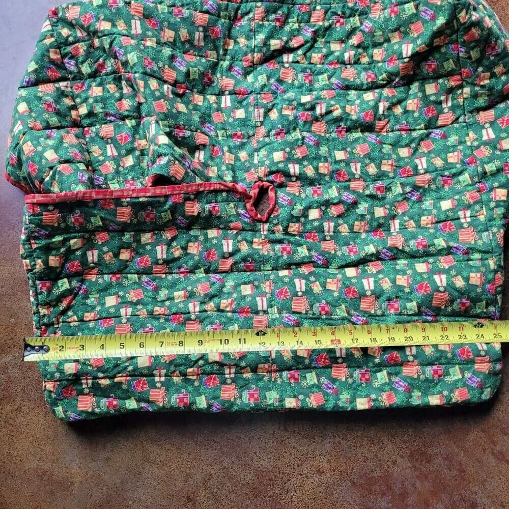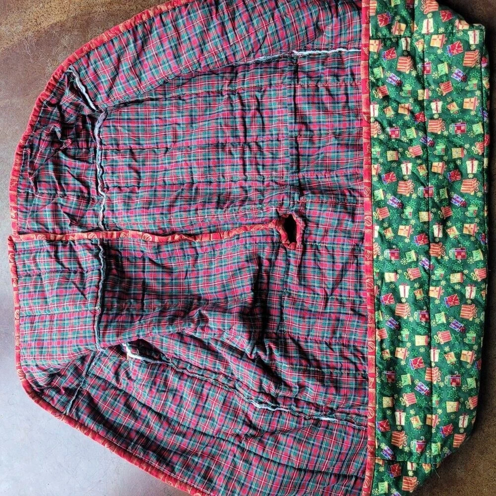 • Reversible design with plaid center • Quilted for durability • Easy to secure around tree base • Festive gift print pattern