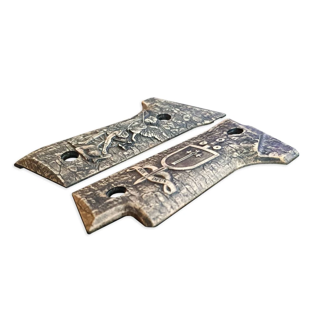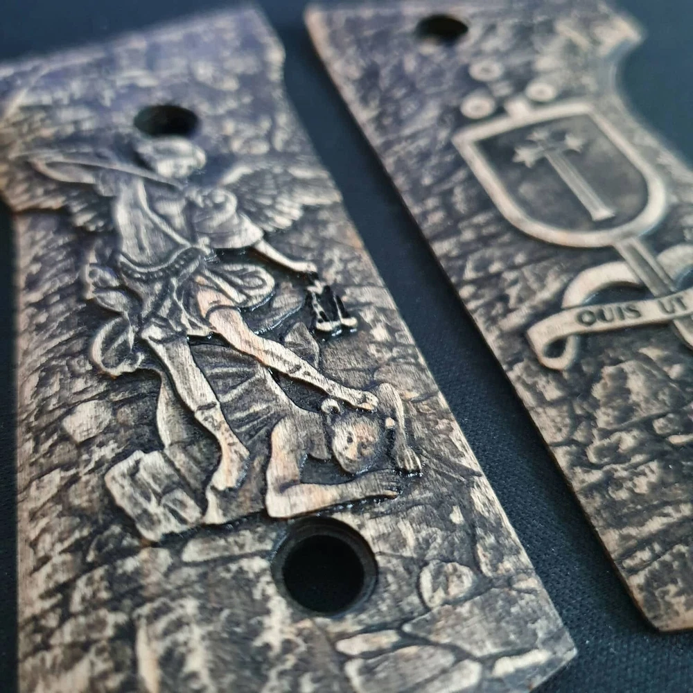 New Beretta 92S grips with "Quis Ut Deus" design. Carved from solid natural wood - Cut by CNC. Grinded, painted and oiled by hand