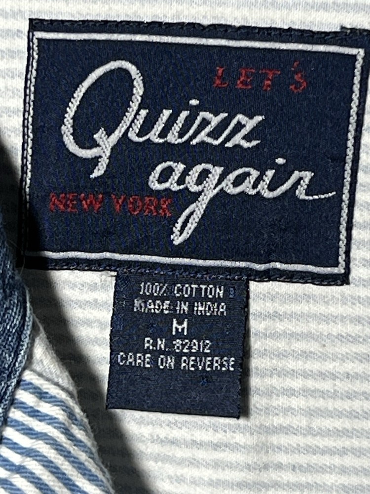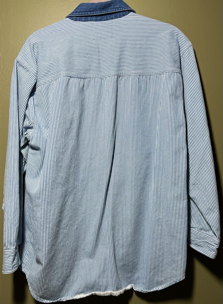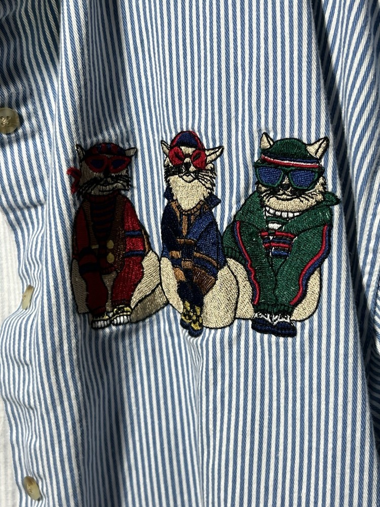 Let’s Quizz Again New York shirt with embroidered cats wearing sunglasses and hoodies. Vintage (late 90s- early 2000s) women’s Medium light blue striped denim button down. I think this fits a bit oversized, so size large would fit this shirt too.
