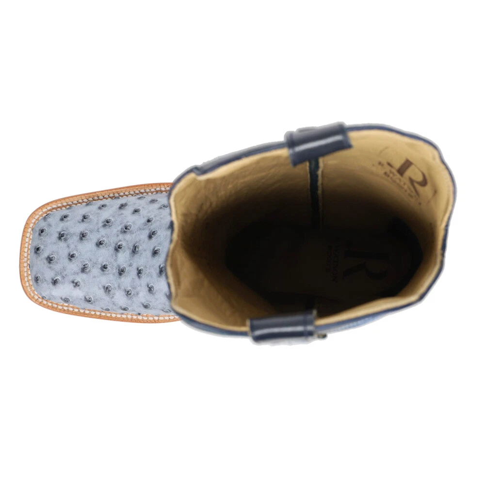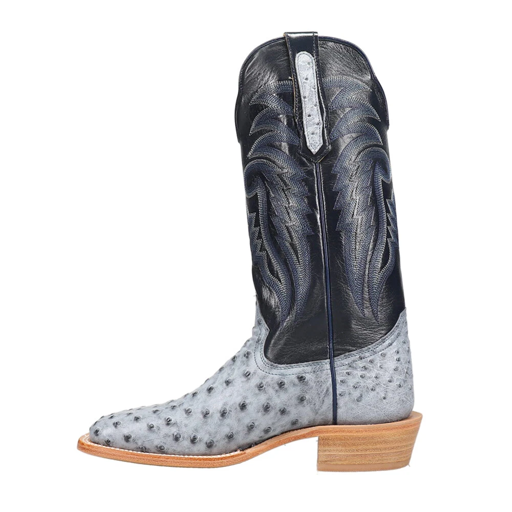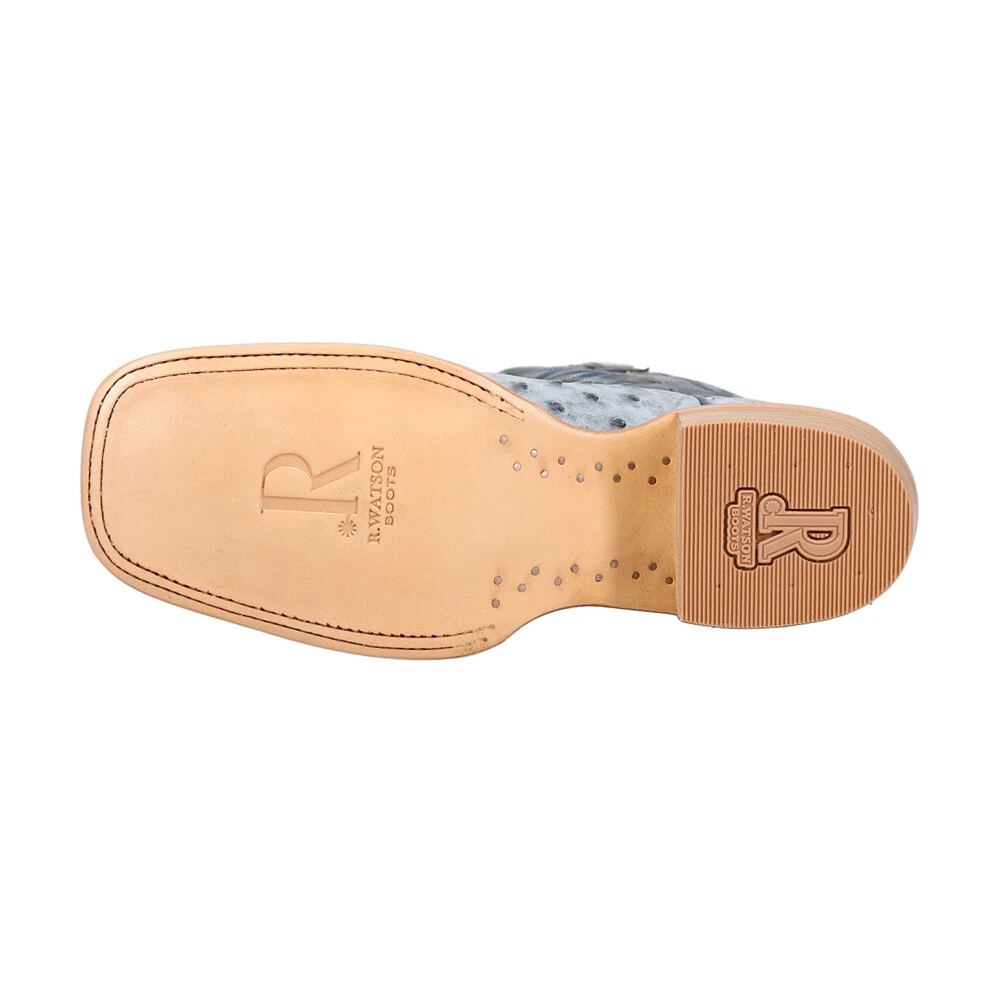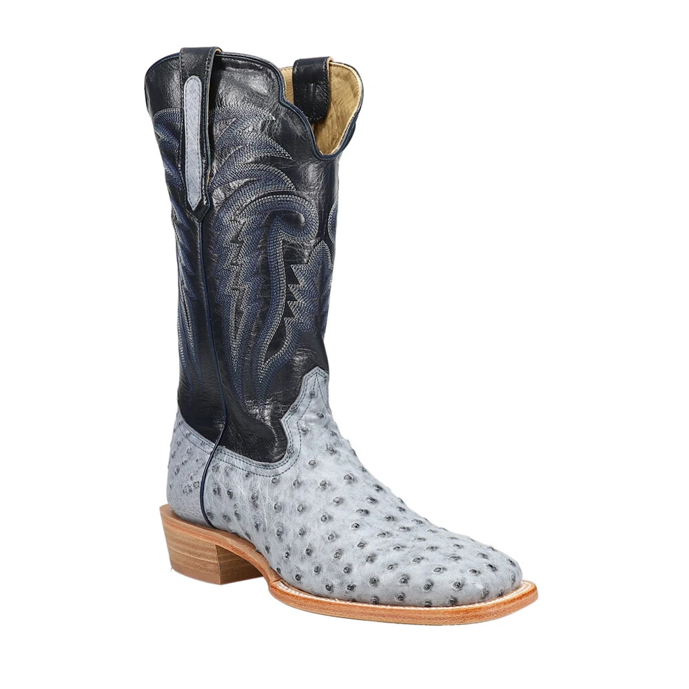 Full Quill Ostrich Embroidered Wide Square Toe Cowboy Boots Product Details Full quill ostrich and goat upper 10 row embroidered stitch pattern All leather stacked heel Solid steel shank Shaft Height 13 Inch R. Watson presents these American blue jean full quill and navy goat western boots. These boots have a 10 row stitch pattern, R. Watson comfort system, all leather stacked heel, counters, solid steel shank, a 10 iron outsole and a 13 inch shaft height. Additional Details Color: Black, Blue Occasion: Dress Gender: Mens Age: Adult Brand: R. Watson Boots