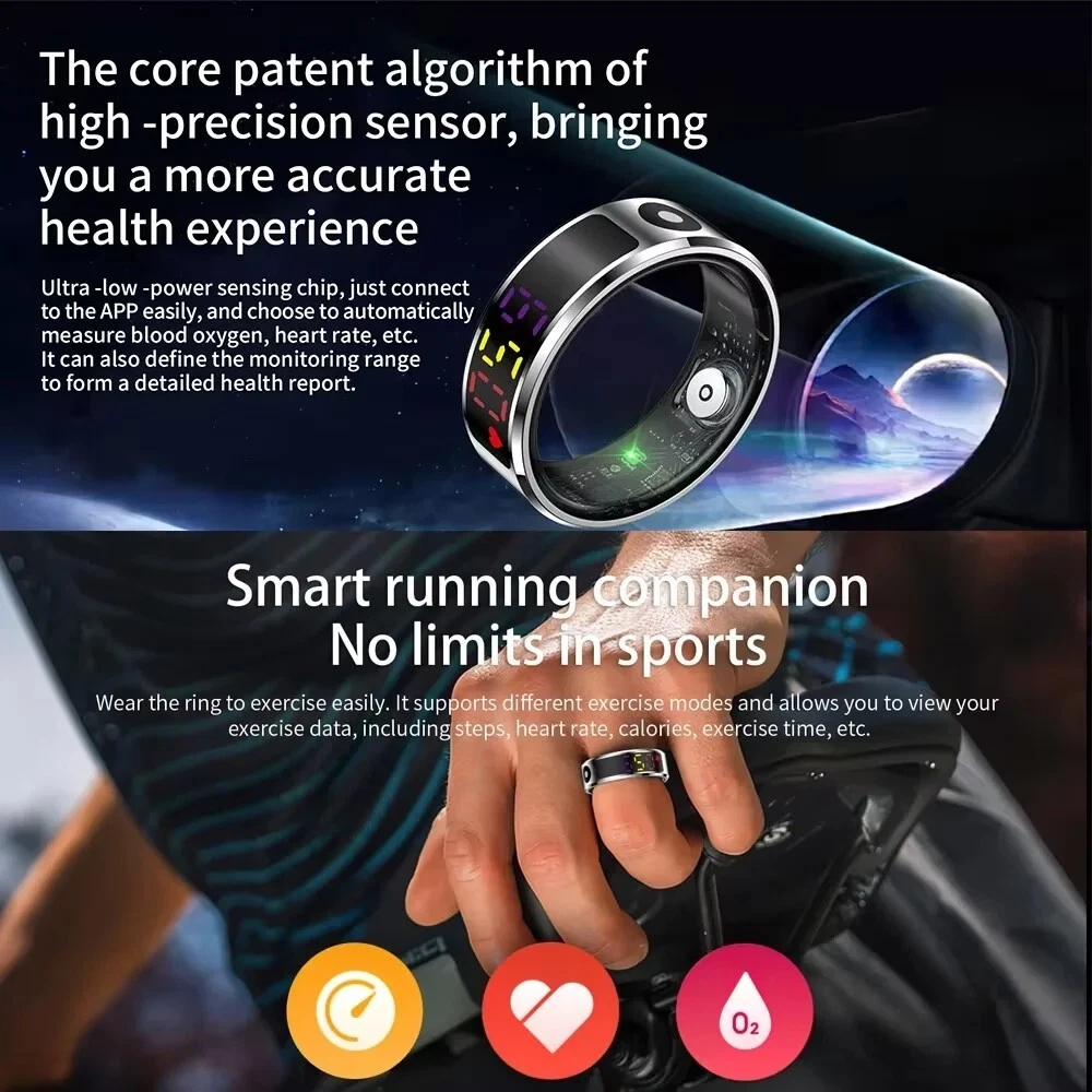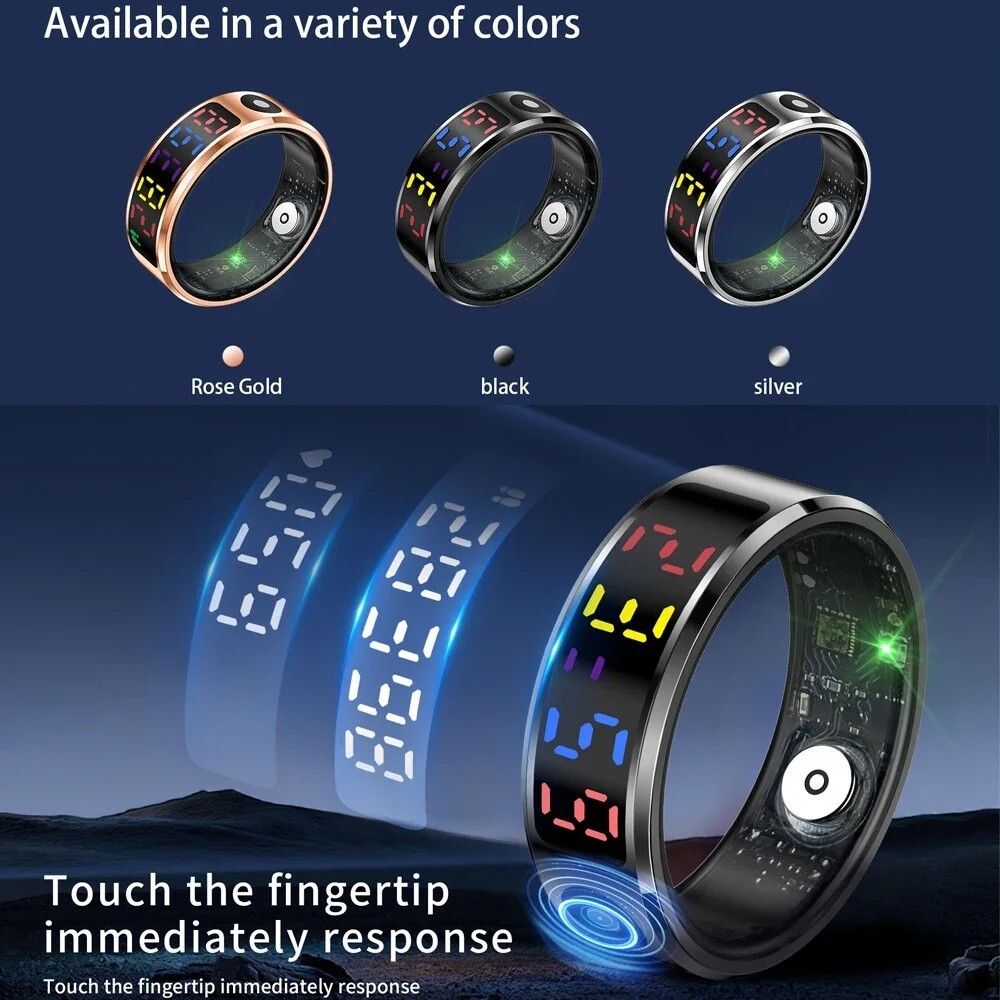 Elevate your tech style with the R12 Color Screen Fashion Smart Ring. This sophisticated accessory doubles as a fitness tracker, putting the health and style at your fingertips. Crafted from durable stainless steel, it's available in sleek silver, gold, or black to complement any look or occasion.Designed for the modern individual, the smart ring boasts an IP68 5ATM waterproof rating, making it a versatile companion for all your activities. Unisex by nature, it suits anyone looking to stay connected and on trend. Whether you're tracking your fitness goals or managing notifications, this smart ring is a stylish and functional choice for the tech-savvy person.