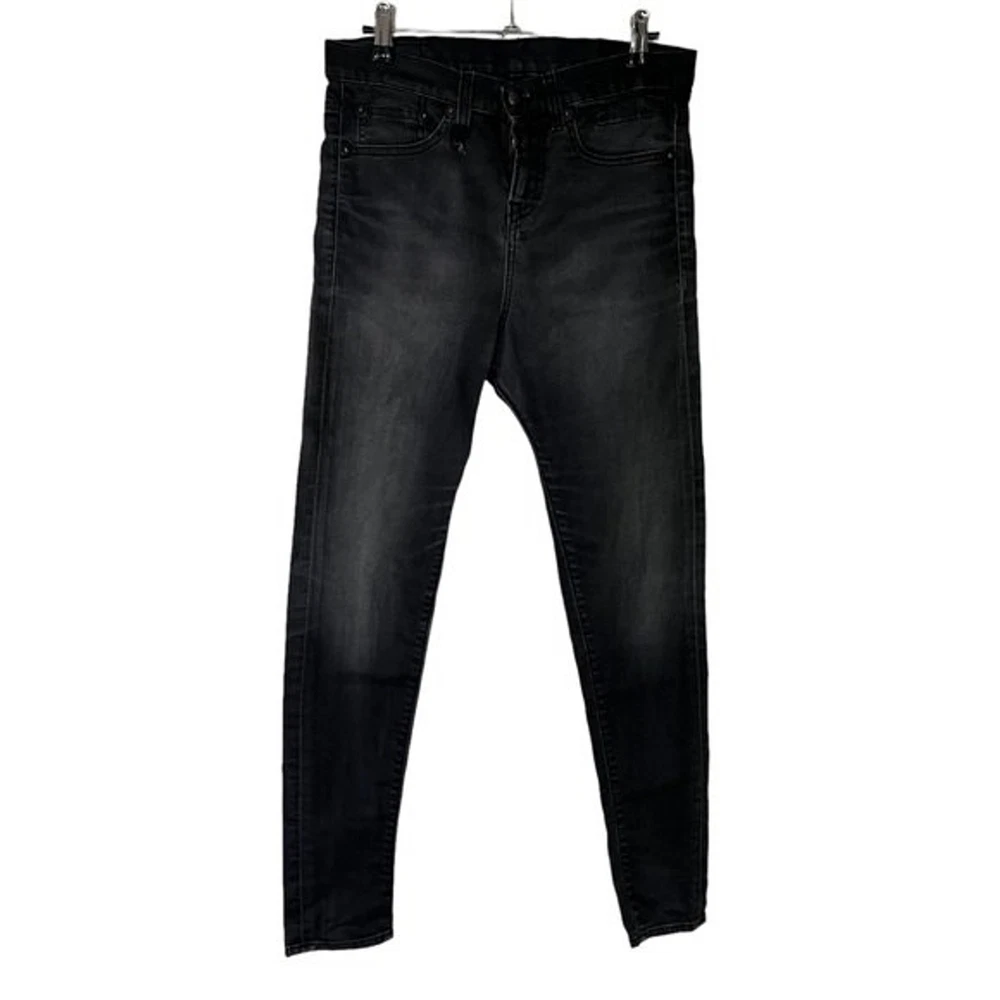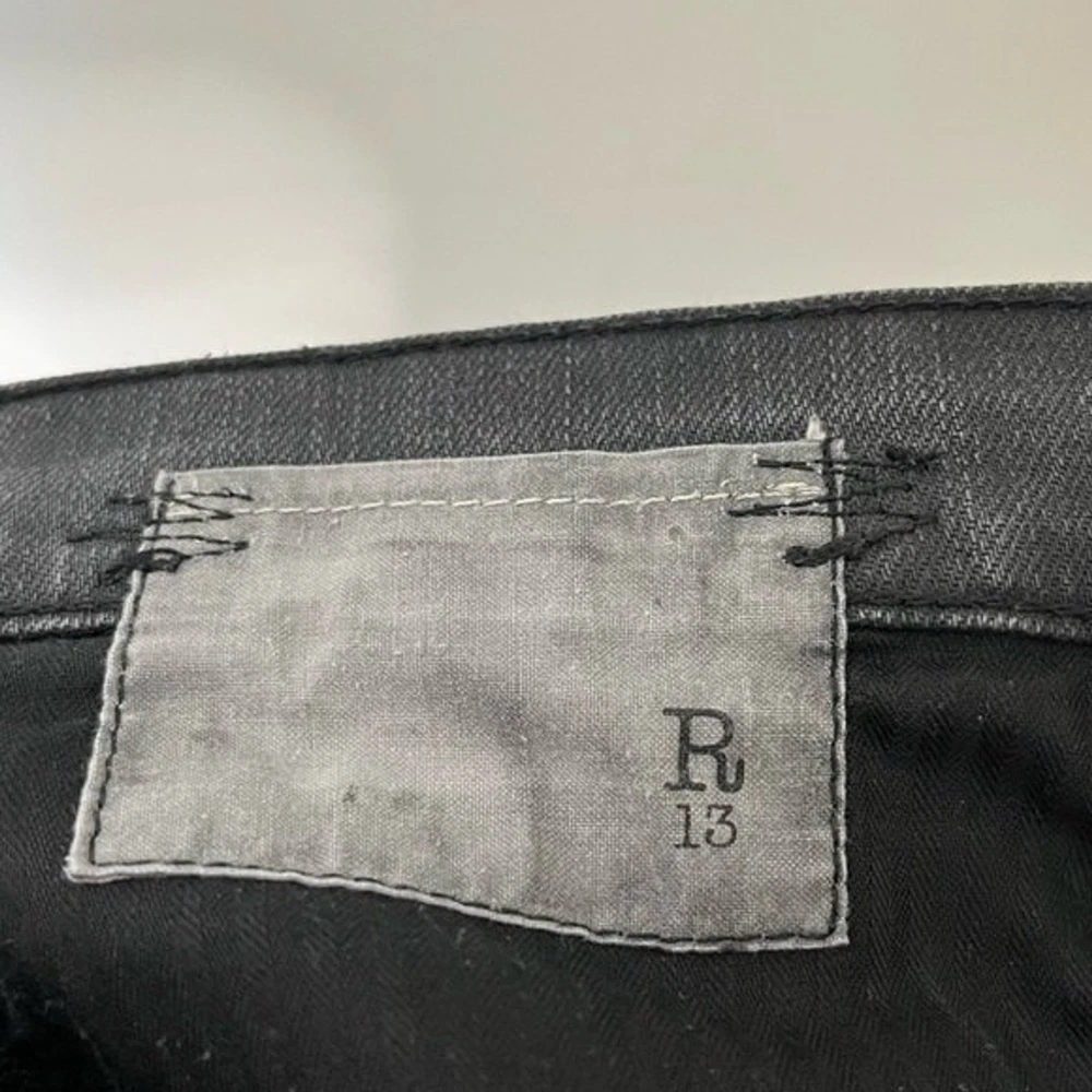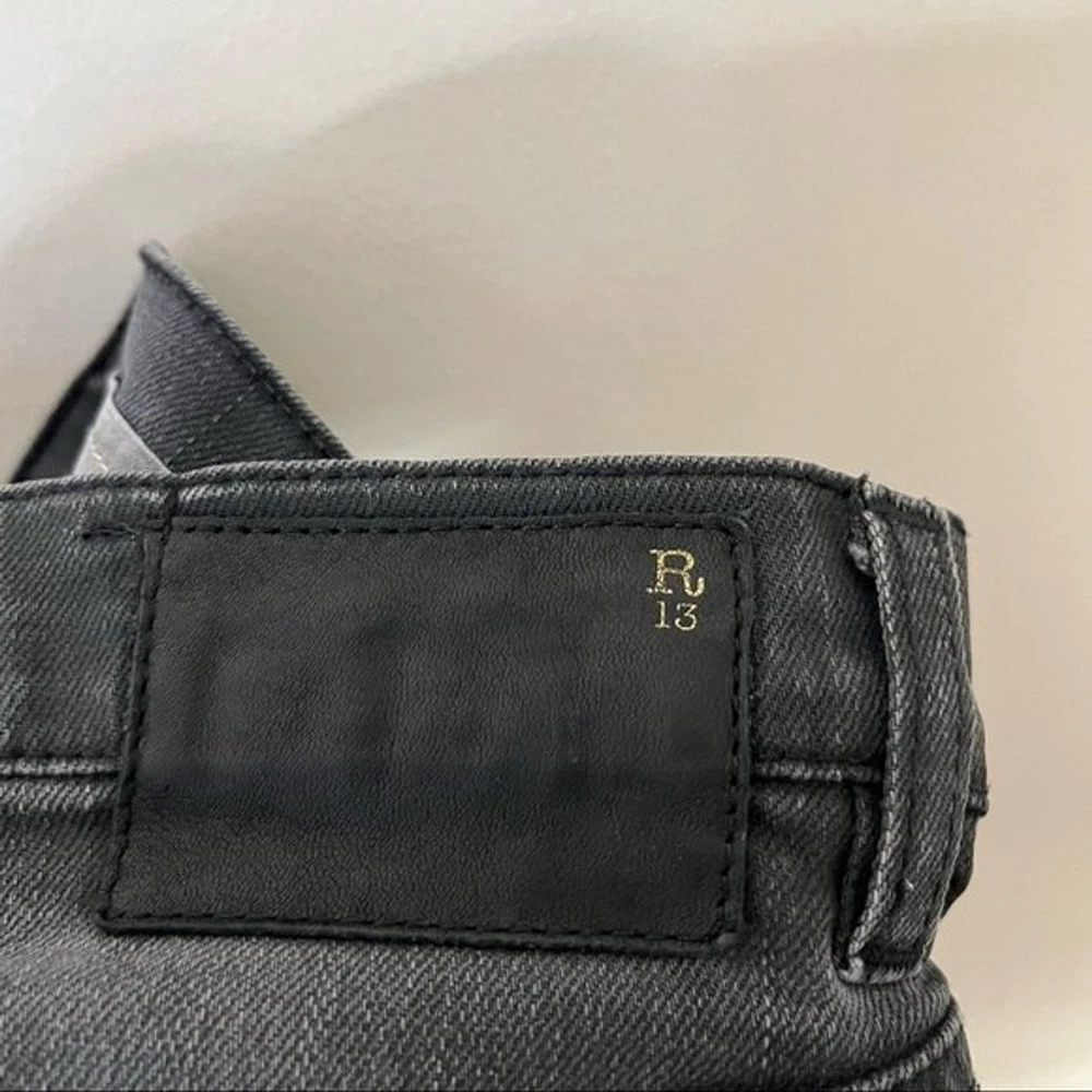 R13 Women's The Drop Dusty Black High Rise Skinny Ankle Jeans Size 25 Fabric: Stretch denim Drop crotch and cropped profile Single-button closure and zip fly 5-pocket styling Approximate Measurements taken flat: waist 15, rise 12, inseam 27 Pre-owned; in excellent condition. No rips, stains or holes. Minor wash wear- noticeable from color transfer on interior tags/labels. Please see all photos for condition details.