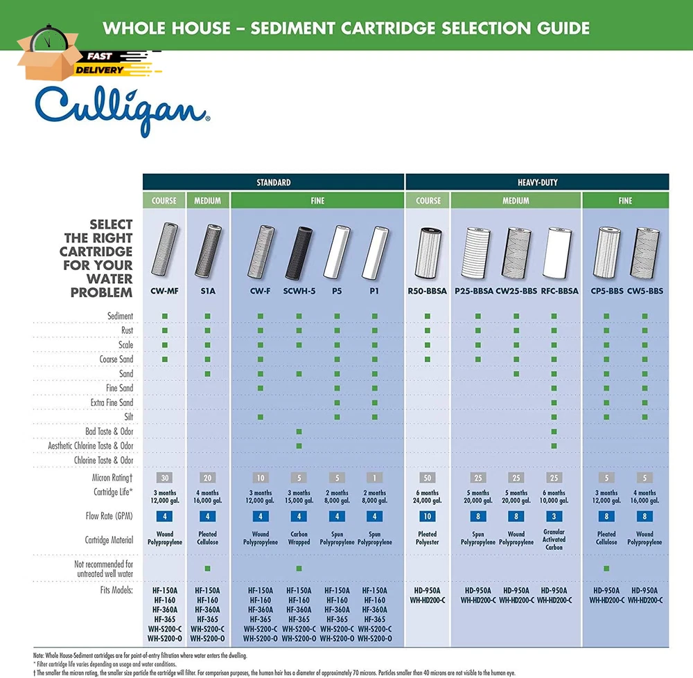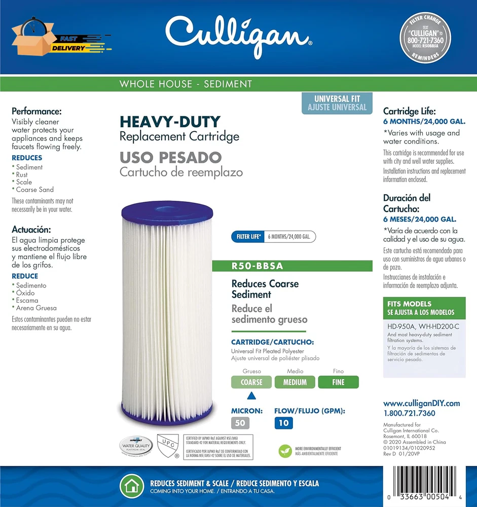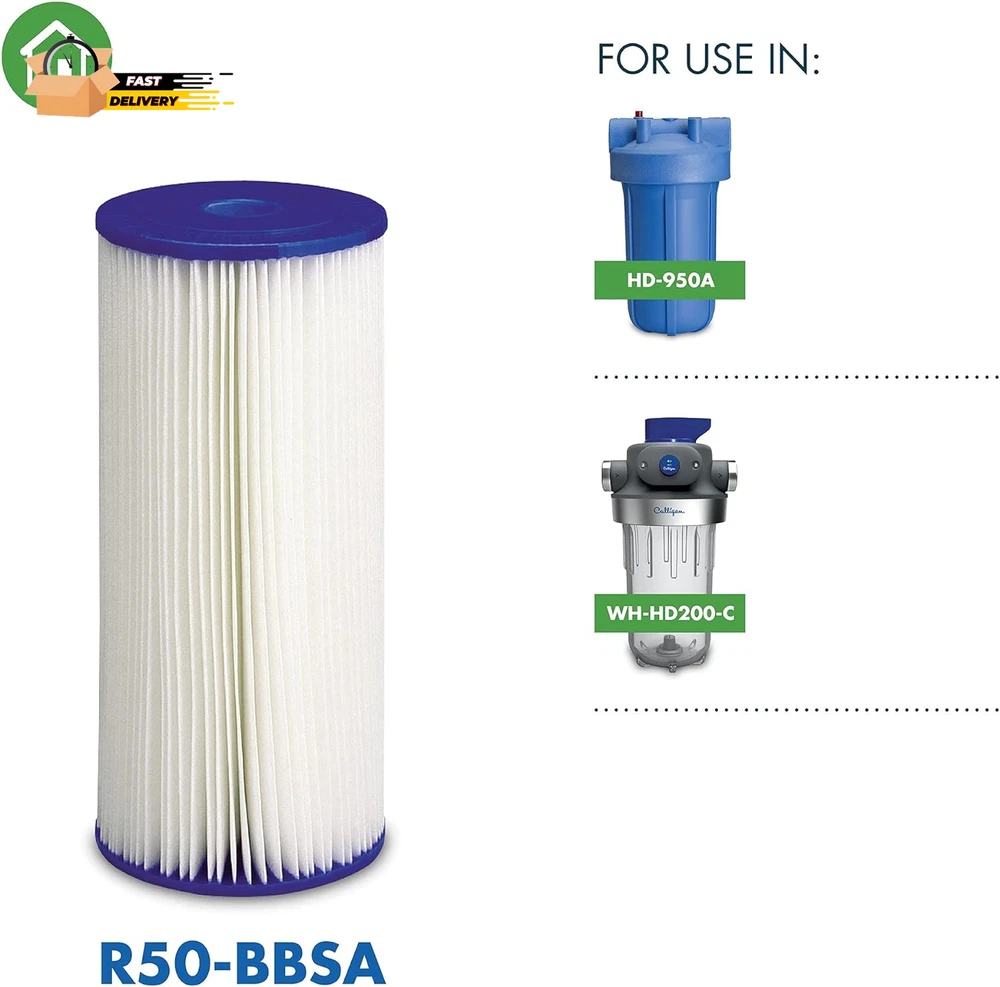 Store New Arrivals Add to Favorite View Feedback Contact R50-BBSA Whole House Heavy Duty Water Filter Cartridge, 24,000 Gallons Description Item model number R50-BBSA Style Replacement Filters Number of Items 1 Pattern Filter Country of Origin USA Warranty Description Warranty Batteries Included? No Unit Count 1.0 Count Batteries Required? No Material Polypropylene (PP) Compatible Water Purifier Models WH-HD200-C Is Discontinued By Manufacturer No Included Components 1 water filter cartridge Item Package Quantity 1 External Testing Certification ANSI, NSF, IAPMO Number Of Pieces 1 Item Weight 0.55 Pounds Part Number 01019134 Mounting Type Plate Mount Color White Product Benefits Reduces sediment, rust, scale, dirt, and coarse sand to extend life of pipes water-using appliances. Global Trade Identification Number 00033663005044 Product Dimensions 4.5"D x 4.5"W x 10"H Size R50-BBSA Filter Long Lasting: Replace your filter every 6 months or 24,000 gallons. Water that is high in sediment will shorten the service life of the filter Compatible with W10-PR, W15-PR, Culligan HD-950A & WH-HD200-C, AP801, GXWH-35F, GNWH-38F, GXWH35F, GXWH30C, GXWH-40L, GXWH-30C, HDSFI, GXWH35F, GNWH38F, GNQH38S, GXWH40L, HF45-10BLBK10PR, WHCF-WHPLBB, WHCFWHPLBB Superior Filtration: For high-flow and well water uses, this whole house filter reduces particles larger than 50 microns at a flow rate of 10 GPM. Reduce sediment, rust, scale, dirt, and coarse sand to extend life of pipes and water-using appliances. Certified materials: Culligan uses quality, food-grade materials that are safe for you and your family. Certified by IAMPO R&T against NSF / ANSI Standard 42 for Material Requirements only Buy with confidence: For over 85 years, Culligan knows every drop of water flowing through your home is important. Should you have any questions regarding the use of your product, you'll enjoy knowledgable and responseive customer service support. Fits HD-950 Level 1 Basic Filtration Filters Coarse (50-micron) sediment filtration: sand, rust and scale Filter life up to 6 months or 24,000 gallons Ideal for high-flow and well-water applications Product Description Product Description The R50-BBSA Basic Whole House Filter for the reduction of coarse sediment is designed to reduce coarse sediment to provide visibly clearer water that helps protect your appliances and keeps your faucets flowing freely. From the Manufacturer Culligan's R50-BBS Level-1 Basic Filtration 50 Micron Heavy-Duty replacement sediment filter cartridge reduces sediment, rust, scale, dirt, and coarse sand. This filter cartridge is ideal for high-flow and well-water applications and has a filter life of up to 6 months or 24,000 gallons. From the Manufacturer Culligan's R50-BBS Level-1 Basic Filtration 50 Micron Heavy-Duty replacement sediment filter cartridge reduces sediment, rust, scale, dirt, and coarse sand. This filter cartridge is ideal for high-flow and well-water applications and has a filter life of up to 6 months or 24,000 gallons. ABOUT US We offer the best prices around on high quality products. Our E-store includes media such as books, movies, music and games while offering electronics, toys, sporting apparel, clothing, tools, general home, garden items and more. SHIPPING We are always working hard to ensure your package arrives as soon as possible. Please understand that some factors like weather, high postal traffic, and the performance of shipping companies are outside of our control. We offer free shipping to the lower 48 states and ship within 2 business days of payment, usually sooner. We do not accept P.O. Boxes. Please provide a physical address. For shipping outside of the continental USA, we only use eBay's Global Shipping Program.The item is shipped to KY and then sent to the rest of the world. International customers are responsible for all duties and taxes. Continue to check out in order to calculate costs for shipping the item to your country. Messages regarding eBay's Global Shipping Program MUST be directed at eBay EXCLUSIVELY. RETURNS We offer a 30-Day Return Policy on items which you are not completely satisfied with. You have the option for a full-refund or an exchange of the item. No returns are available on items shipped outside of the USA. PAYMENT We accept PayPal. CONTACT US This page content is yet to come Please ad us to your favorite seller and visit again later Thank You CUSTOMER SATISFACTION We try our very best to make sure every customer is completely satisfied. If there's a problem, message us! We're happy to help. WE ACCEPT Copyright © 2021 AutoDS. | All Rights Reserved