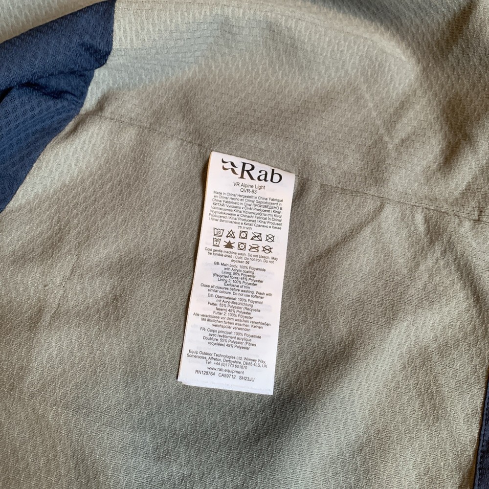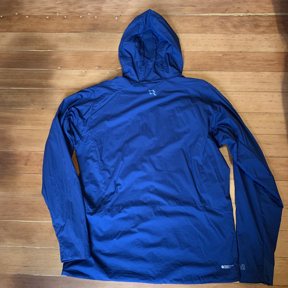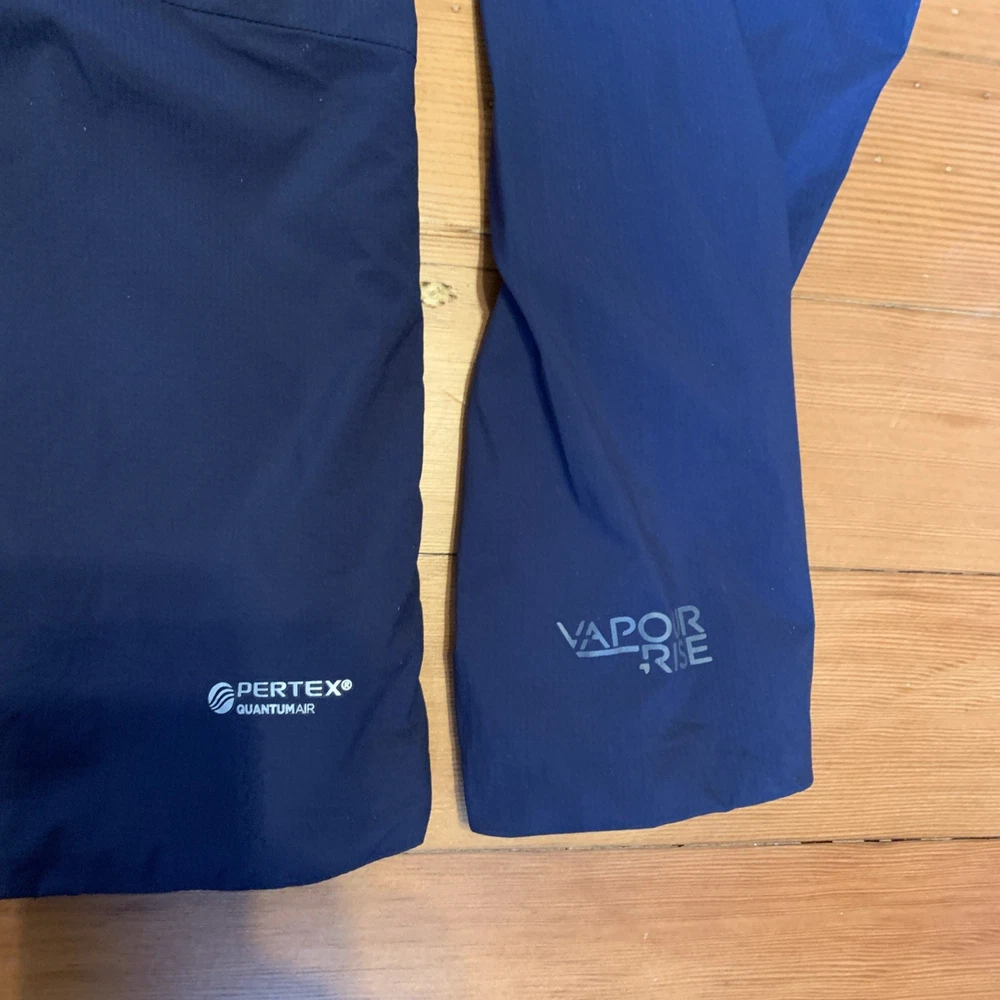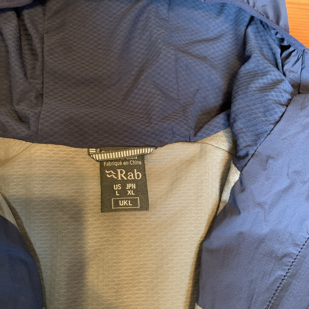 The RAB Men's Vapour-Rise Alpine Light Jacket in Navy is a relaxed fit, full zip hoody designed for outdoor activities. Made from polyester with a soft thermal layer is both warmth and breathable. Navy blue color with gray zipper accents and gray lining. The only reason I marked this jacket as good pre-owned condition as opposed to excellent is because there are a couple minor snag in the lining that I have photographed.