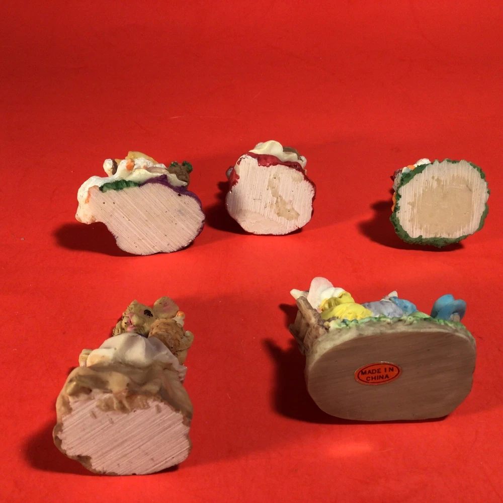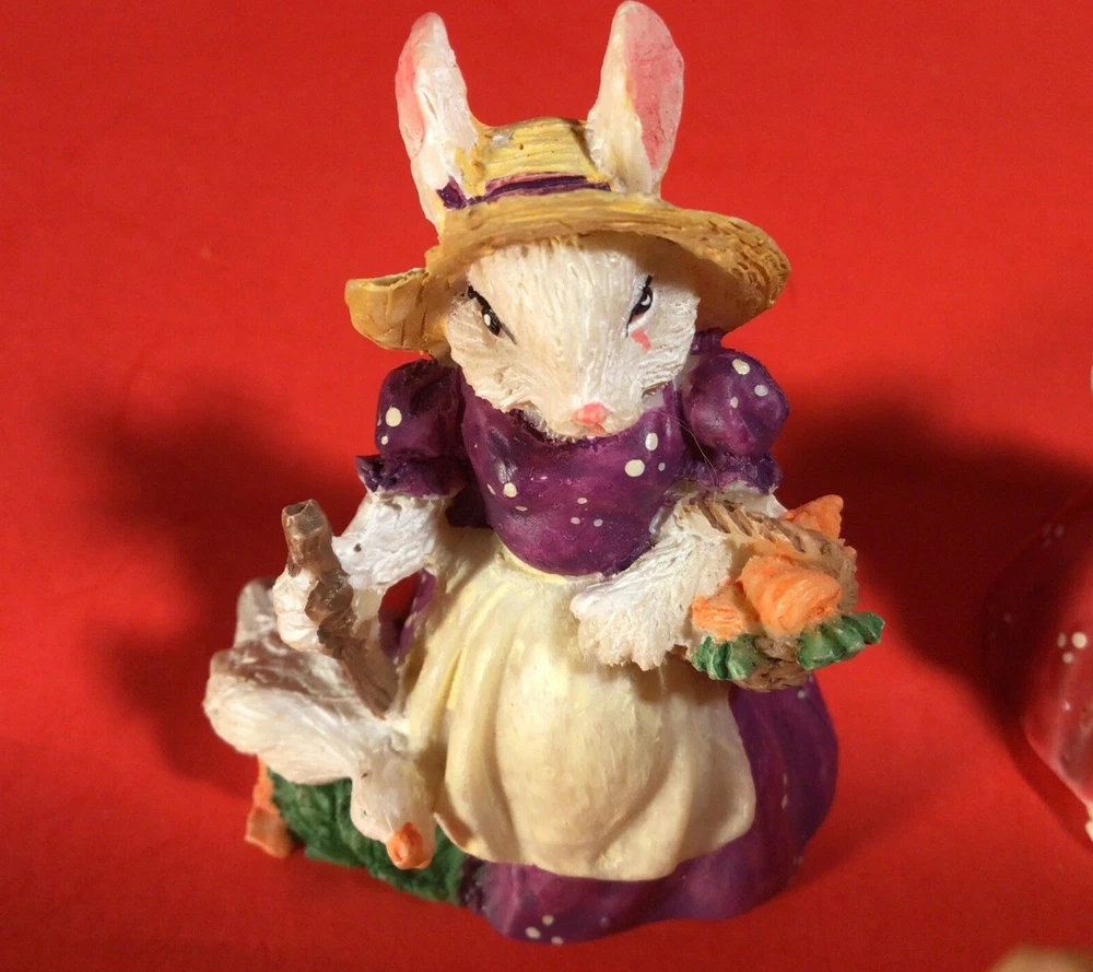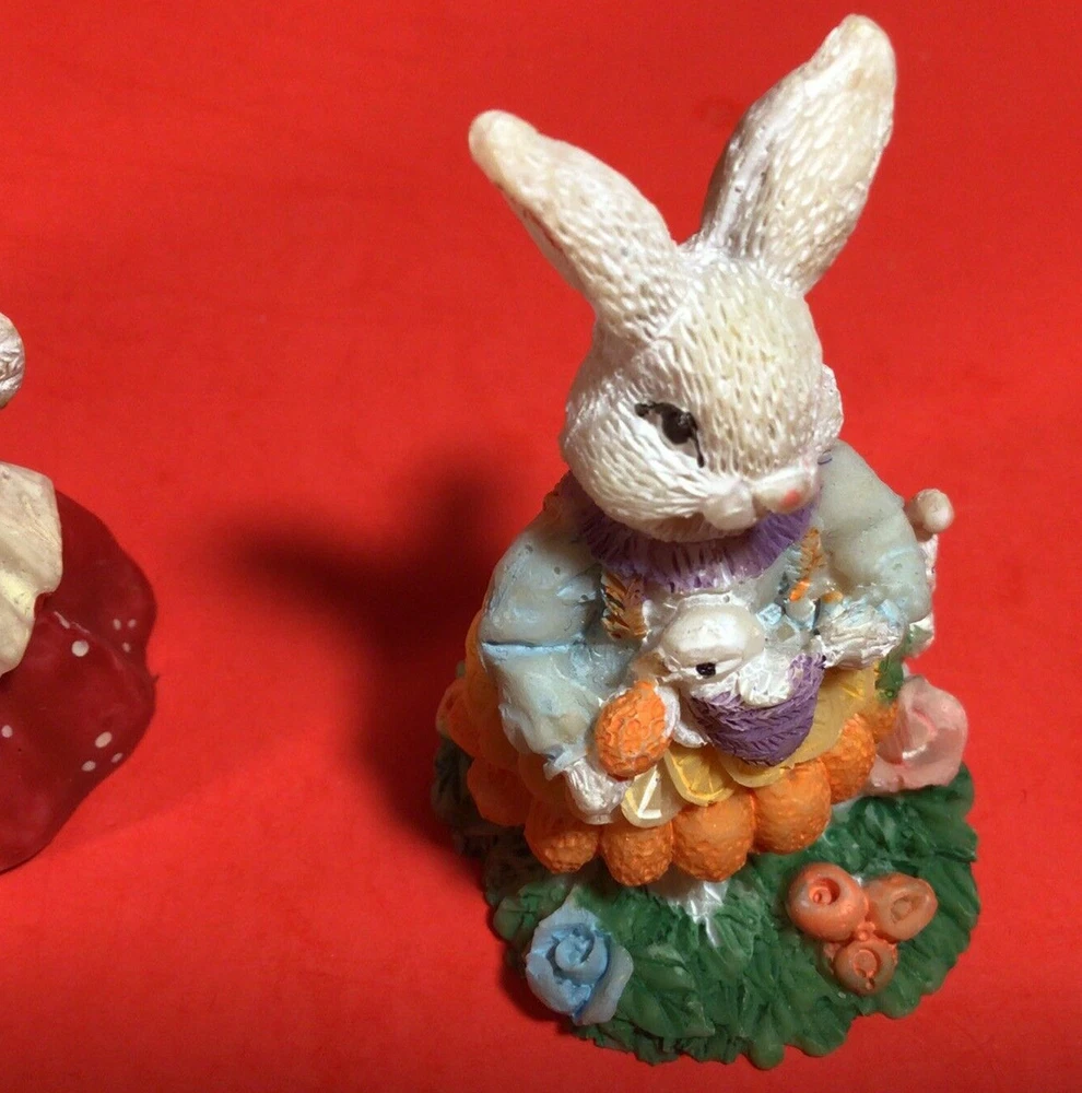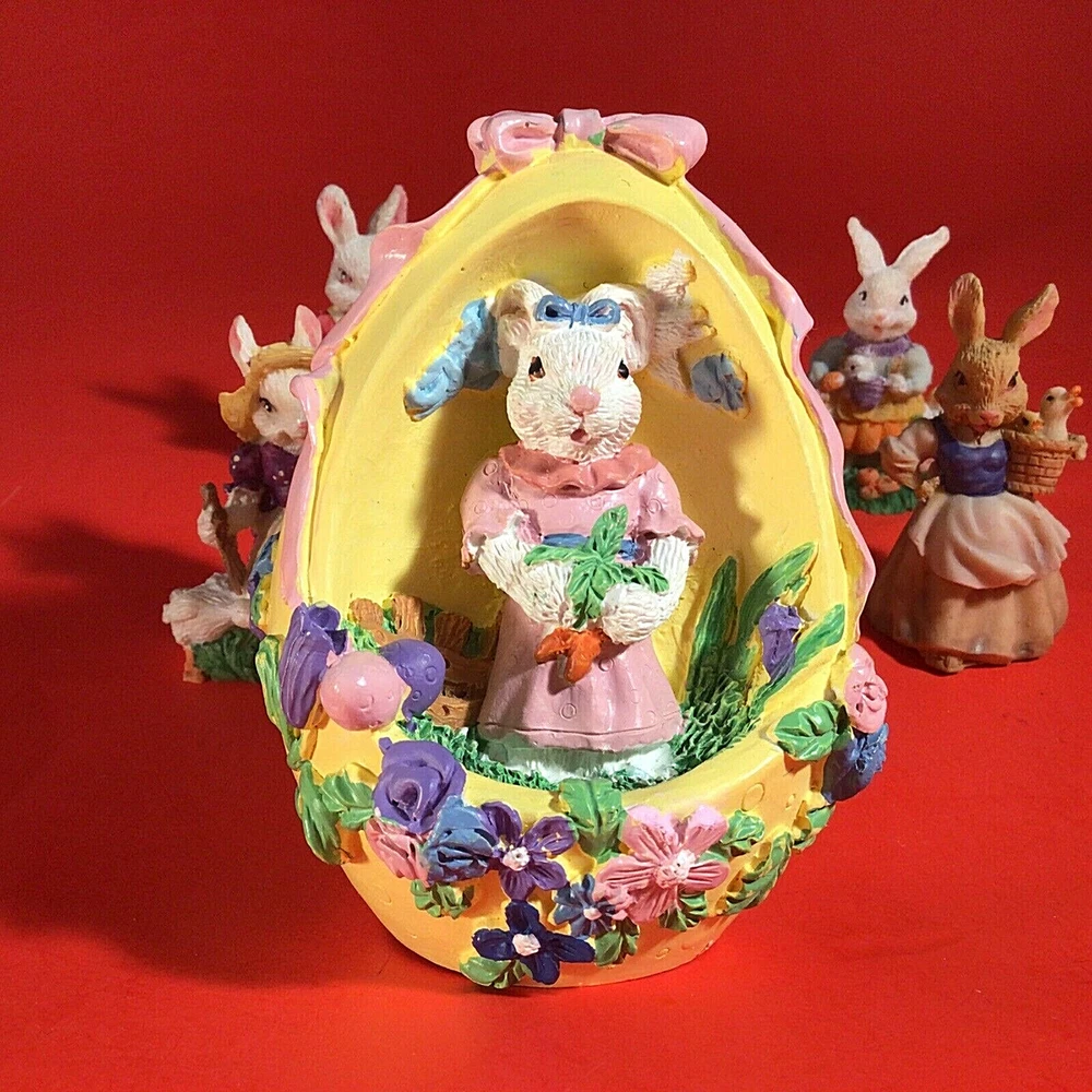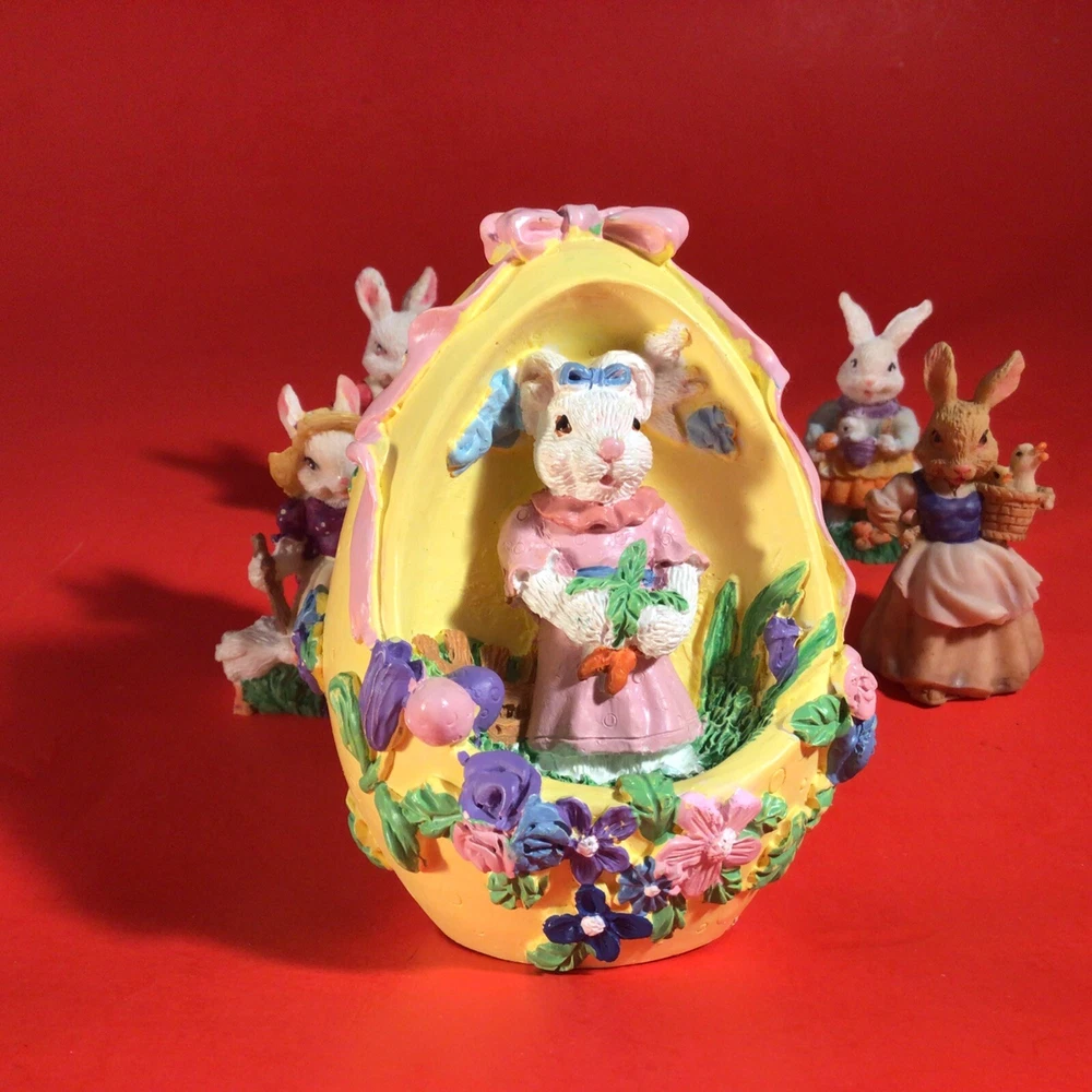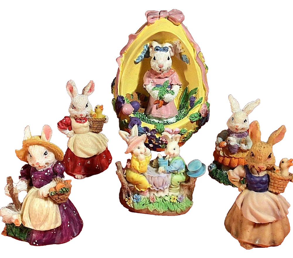 LOT OF EASTER BUNNY RABBITS. EGG WITH BUNNY INSIDE 4 INCHES HIGH. 5 LITTLE DRESSED UP BUNNY RABBITS. THEY RANGE FROM 1 3/4 TO 2 1/4 INCHES TALL. 1 BUNNY HAS A LITTLE CHIP ON HER HAT. I DON'T SEE ANYMORE. THEY ARE ADORABLE. POSSIBLY RESIN BUT NOT SURE? IF YOU HAVE ANY QUESTIONS OR WOULD LIKE MORE PHOTOS PLEASE MESSAGE US. THANK YOU SO MUCH FOR SHOPPING WITH US! WE ENCOURAGE YOU TO CHECK OUT OUR CUSTOMER REVIEWS. CHECK OUT AND FOLLOW OUR STORE FOR MORE GREAT ITEMS AS WE ADD TO OUR INVENTORY ALMOST DAILY. http://stores.ebay.com/wootieswonders THANKS AGAIN. KEN AND CAROL