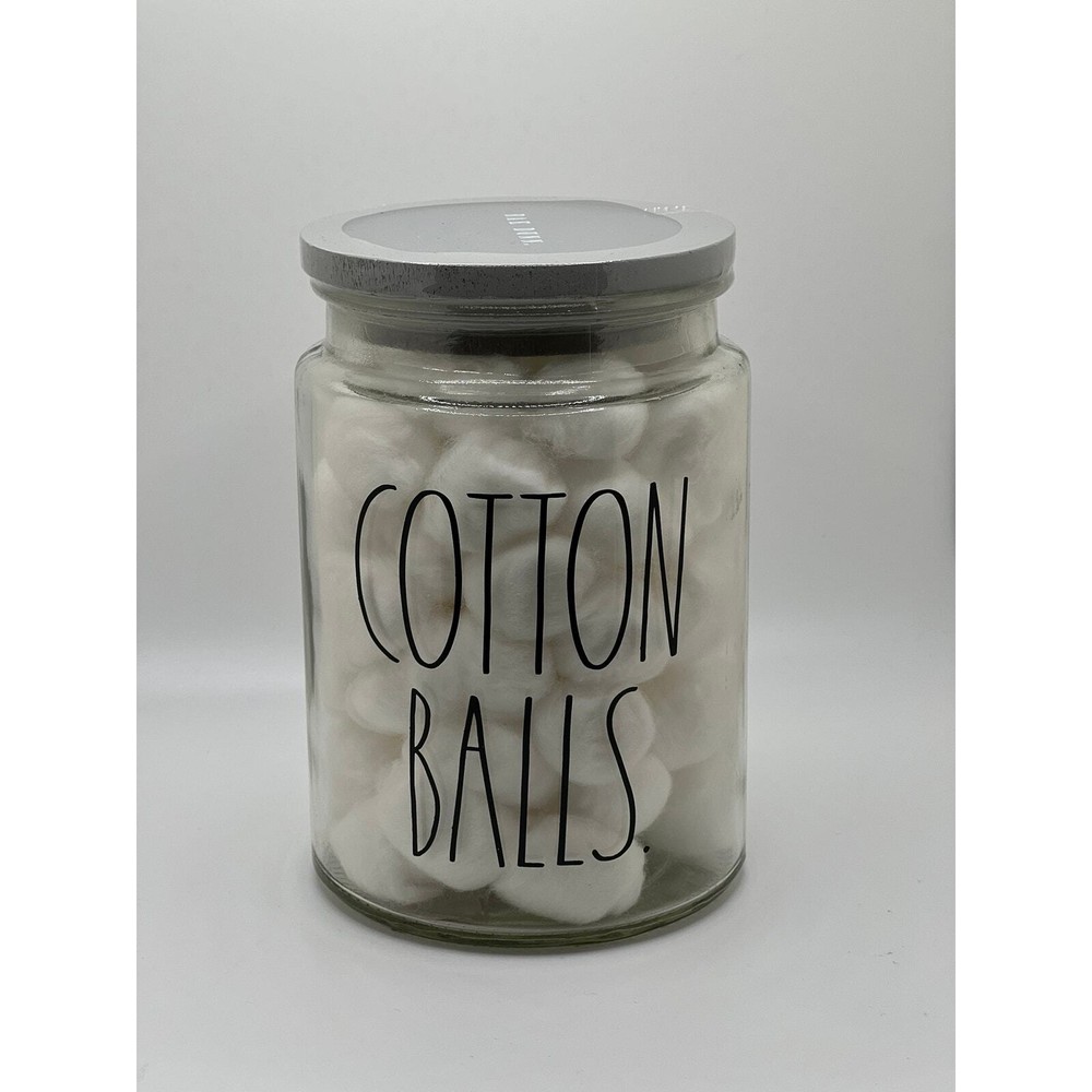 RAE DUNN COTTON BALLS Glass Jar Gray Lid NWTGlass jar with wooden lid comes with 60 cotton balls.
