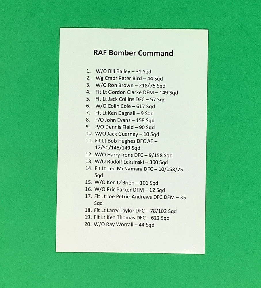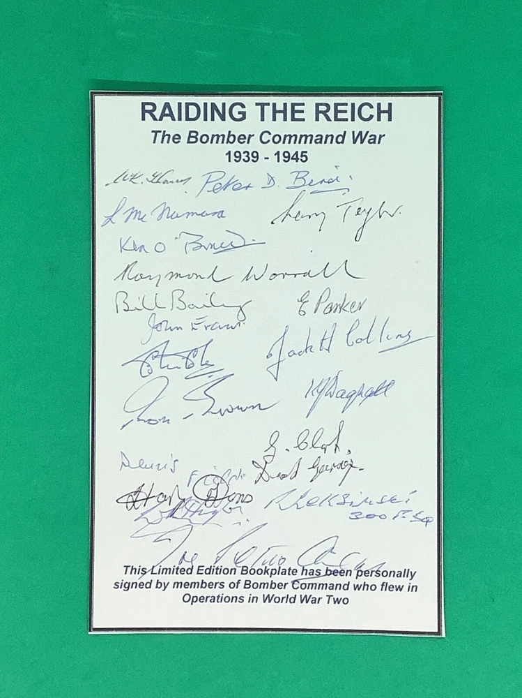 Bookplate autographed by 18 World War Two Royal Air Force Bomber Command veterans. I am selling my WWII memorabilia collected over 40 years. Most of the items are signed and include veterans from all major combatants - the United States, Britain, Germany and Canada - and all service branches - Army, Navy, Air Force and USMC. Please check back as it will take some time to list everything.