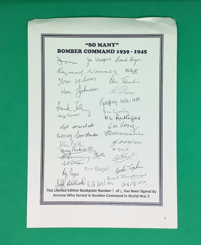 Bookplate autographed by 32 World War Two Royal Air Force Bomber Command veterans. I am selling my WWII memorabilia collected over 40 years. Most of the items are signed and include veterans from all major combatants - the United States, Britain, Germany and Canada - and all service branches - Army, Navy, Air Force and USMC. Please check back as it will take some time to list everything.