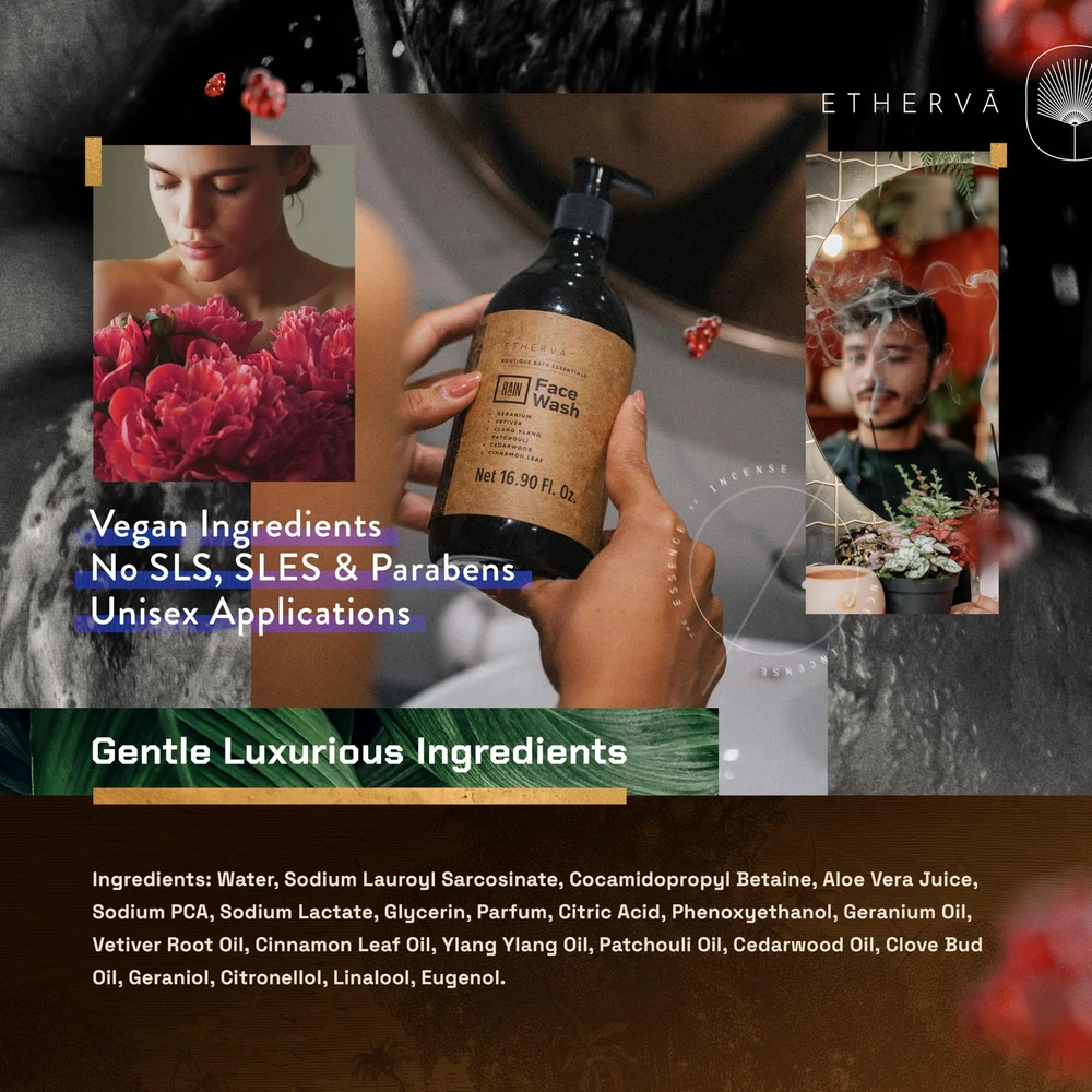 ✋ Advice Prior to Purchase: This product is specifically crafted for connoisseurs of niche woody, earthy & floral fragrances and all natural vegan ingredients. It contains a potent combination of pure essential oils and herbal extracts creating a unique fragrance profile. It's recommended to carefully study if this fragrance profile matches your taste, prior to making a purchase. 🌳 Incense Infused Geranium Garden: “Rain” our unisex Ayurveda based luxury face wash, reminds one of a Geranium flower garden pervading with floral & spicy incenses. Green, grassy, spicy and minty with hints of monsoon blooms, this Geranium powerhouse is layered with sweetness of Ylang Ylang and spicy and woody notes of Patchouli, Cedarwood, Cinnamon & Clove Buds. A true gentle cleanser, scented with the goodness of the finest pure essential oils. 🌳 Pure Luxurious Essential Oils / No Chemical Fragrances: Emulating high end luxury perfumes, attars and incenses, our vegan body wash exclusively harnesses pure all natural essential oils extracted from herbs, spices, fruits and flowers. Raw ingredients are procured during peak harvest seasons from various corners of the Indian subcontinent. Essential oils are extracted from these premium ingredients using steam distillation. 🌳 Sulfate & Paraben Free / No SLS: Our products do not contain (SLS) sulfates. Instead we use a naturally derived, anionic surfactant known as “Sodium Lauryl Sarcosinate”, not to be confused with SLS. All our cleansers use “Sodium Lauryl Sarcosinate” as it is a milder and gentler cleansing agent which doesn’t leave your skin or scalp dry and irritated like common sulfate based surfactants do. All our natural cleansers are crafted cruelty free. 🌳 Essential Ayurvedic Properties: Geranium, Vetiver, Ylang Ylang, Patchouli possess 'vata’ & 'pitta’ balancing properties. Aloe Vera as a base acts as soothing, healing, revitalising and hydrating medium. Sweet and spicy hints of Cinnamon and Clove Buds add a grounding note. This foaming face wash will cleanse your facial skin leaving a soft glow and a refreshed feel for hours after. The best all natural face wash experience for oily and sensitive skin. 🌳 Ingredients: Water, Sodium Lauroyl Sarcosinate, Cocamidopropyl Betaine, Aloe Barbadensis Leaf Juice, Sodium PCA, Sodium Lactate, Glycerin, Parfum, Citric acid, Phenoxyethanol, Geranium Oil, Vetiver Root Oil, Cinnamon Leaf Oil, Ylang Ylang Oil, Patchouli Oil, Cedarwood Oil, Clove Bud Oil, Geraniol, Citronellol, Linalool, Eugenol.