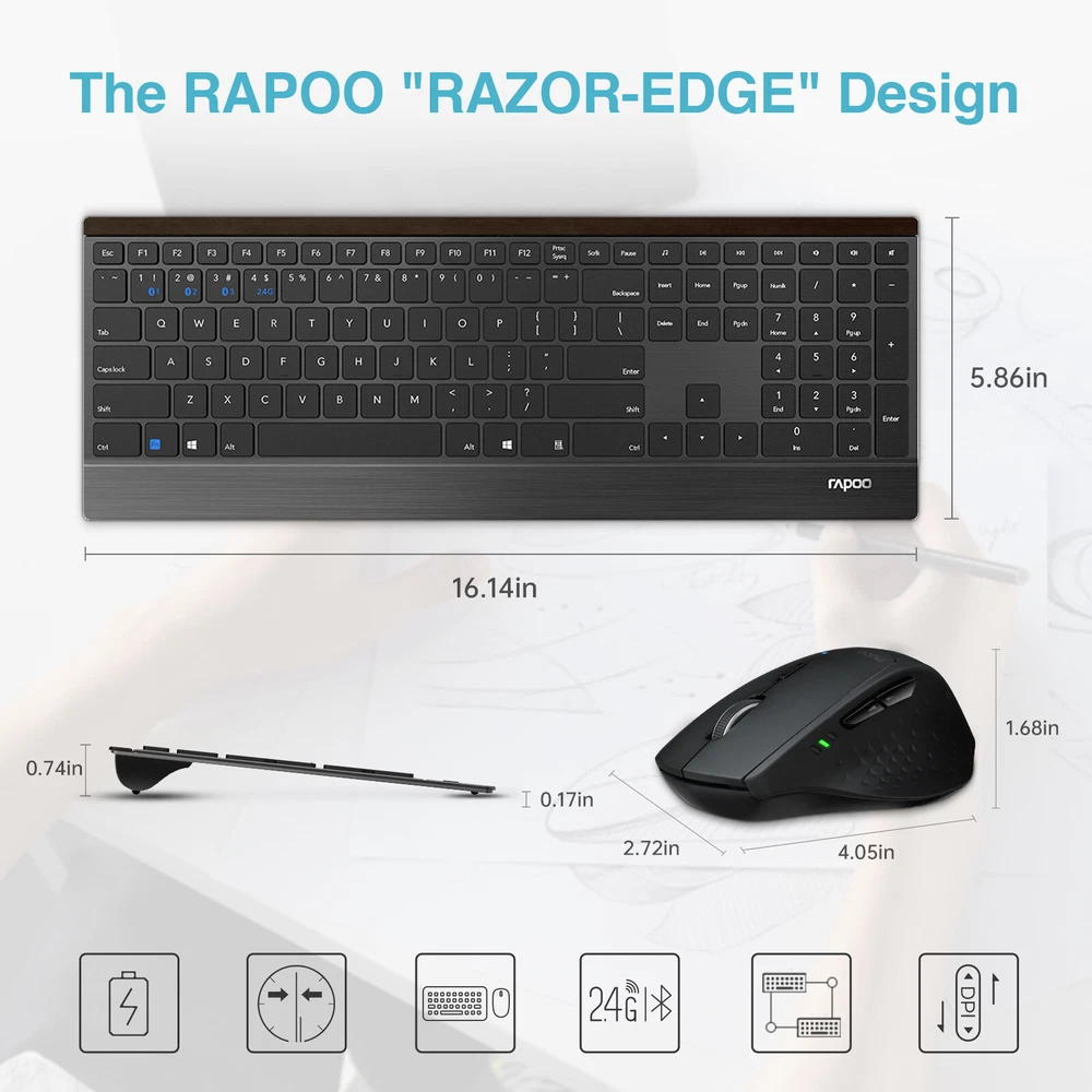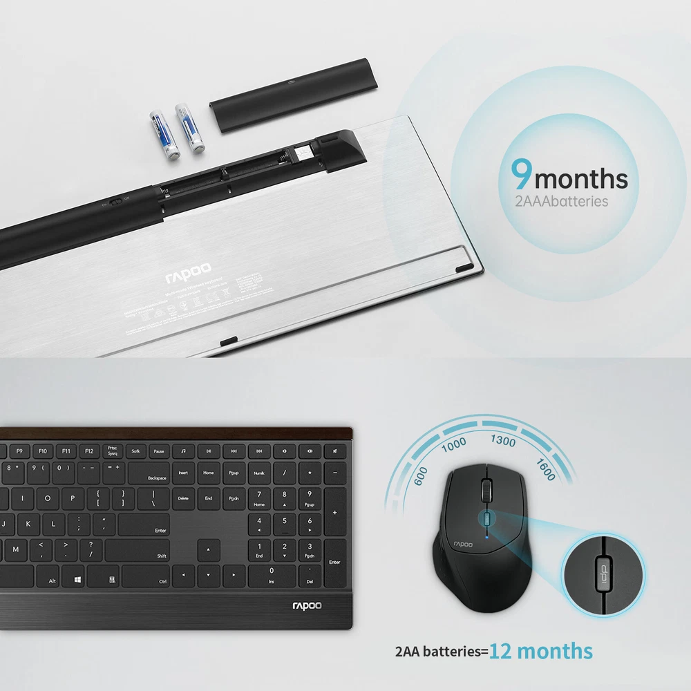 Connectivity Technology: Bluetooth, USB Key Type: Membrane Special Features: Portable, Ultra-slim Compatible System: Windows, Androids Compatible Devices: PC, Laptop, Tablet, Smartphone Mouse Movement Detection: Optical Mouse DPI: 600-1600 Keyboard Battery: 2 x AAA batteries (included) Mouse Battery: 2 x AA batteries Battery Life: Up to 12 months (varies on use frequency) Keyboard Dimensions: 410*149*19mm Mouse Dimensions: 102.9*69.3*42.7mm What’s in the box: 1 x Wireless Keyboard 1 x Wireless Mouse 1 x User Guide Home Payment Shipping Return Policy About Us Contact Us Feedback Title KEYBOARD & MOUSE COMBO OFFICE KEYBOARD OFFICE MOUSE GAMING KEYBOARD GAMING MOUSE RAPOO 9500M Multi-Device Slim Wireless Keyboard and Mouse Combo for PC Laptop Product Description Wireless Keyboard and Mouse Combo - RAPOO 9500M Multi-Device Wireless Keyboard and Mouse Combo, Portable Ultra-Slim Keyboard and Mouse Set, Computer Keyboard for Windows XP/Vista/7/8/10 or Later 【Multi-device Connection Wireless Combo】RAPOO 9500M both the mouse and the keyboard can be connected using Bluetooth at the same time, and three devices can be connected. The keyboard can be switched by FN+1/2/3; the device can be switched by the Bluetooth button at the bottom of the mouse; it is very suitable for people who use multiple devices for office work. 【2.4GHz Wireless Keyboard and Mouse Combo】The RAPOO 2.4GHz Transmission Technology can provide anti-interference stable transmission and make sure you to enjoy the wireless freedom, just plug and play, no driver or software required. The 2.4GHz technology ensures a strong and reliable connection within 10-meter working range.The USB receiver is plugged into the battery compartment of the mouse. 【Full Size Wireless Keyboard】 Standard US layout (QWERTY) with number pad, each key is independently and appropriately spaced to prevent hitting the wrong key simultaneously. 12 multimedia hotkeys combined help you to play music and movie, browse the web, open email and more, extremely convenient and efficientThe scissor foot design and chocolate keycaps can effectively reduce keyboard noise and bring you a comfortable experience. 【Programable Wireless Mouse】The RAPOO wireless mouse has 6 customizable programming keys. You can download custom macro software on the RAPOO official website, bringing a personalized experience to your office or game. DPI adjustable mouse delivers 4-level of DPI (600/1000/1300/1600) to cater for your different needs in sensitivity. 【Long Battery Life】The ergonomic wireless keyboard is powered by 2 AAA batteries support 12 months, and the wireless mouse is powered by 1 AA batterysupport 12 months (batteries are pre-included). Both mouse and keyboard have an on/off switch, turn them off when not use. save battery life and reduce battery replacement. Please Rest assured that Rapoo provides 1-year warranty for this product after the 30-day return window shuts. If you have any questions, please feel free to contact us. Product Specifications Connectivity Technology: Bluetooth, USB Key Type: Membrane Special Features: Portable, Ultra-slim Compatible System: Windows, Androids Compatible Devices: PC, Laptop, Tablet, Smartphone Mouse Movement Detection: Optical Mouse DPI: 600-1600 Keyboard Battery: 2 x AAA batteries (included) Mouse Battery: 2 x AA batteries Battery Life: Up to 12 months (varies on use frequency) Keyboard Dimensions: 410*149*19mm Mouse Dimensions: 102.9*69.3*42.7mm What’s in the box: 1 x Wireless Keyboard 1 x Wireless Mouse 1 x User Guide 2.4G wireless connection Bluetooth connection Custom Macro Settings 2.4G wireless connection KEYBOARD Short press Fn+4 on the keyboard to connect Bluetooth connection KEYBOARD Long press the combination key Fn+1 or Fn+2 or Fn+3 for more than three seconds to connect three different Bluetooth devices respectively. The keyboard will be searchable within 60 seconds. Complete Bluetooth pairing on your device Short press the keyboard Fn+1 or Fn+2 or Fn+3 or Fn+4 to switch between paired devices cyclically MOUSE Turn on the mouse switch, the device indicator flashes quickly Press the device switch key to select the channel to which the device is connected Press the Bluetooth code key at the bottom, the device indicator light flashes slowly Bluetooth connection device, the device indicator stops flashing and keeps on for 6 seconds Custom Macro Settings The 6 custom buttons of the mouse can be set through the driver to create your own office shortcuts. The driver needs to log in to the official website of rapoo.cn to download The main page of the driver can be used to set the speed of the Windows pointer, and the speed of the mouse up and down scroll wheel. Click the programmable button to pop up the "Case Setting Panel", select "Basic Function/Windows Function/Media Function/Mouse Function/Advanced Function" to simplify some actions Brand RAPOO Connectivity Bluetooth, Radio Frequency, RF, Wireless, USB Type Membrane Number of Mouse Buttons 7 Model 9500M Features Portable, Quiet Keys, Ultra-slim Tracking Method Optical Maximum DPI 1600 Key Type Membrane Compatible System Windows,Androids Compatible Devices PC, Laptop, Tablet, Smartphone MPN 9500M Unit Quantity 1 Unit Type Unit Country/Region of Manufacture China Manufacturer Warranty 1 Year Color Black Keyboard Dimensions 410*149*19mm Mouse Dimensions 102.9*69.3*42.7mm Keyboard Power Supply Mode 2 AAA Alkaline battery(Pre-installed) Mouse Power Supply Mode 2AA alkaline battery(Pre-installed) Keyboard Language English Keyboard Layout QWERTY (Standard) Item Height 1.9cm Item Length 41cm Item Width 14.9cm