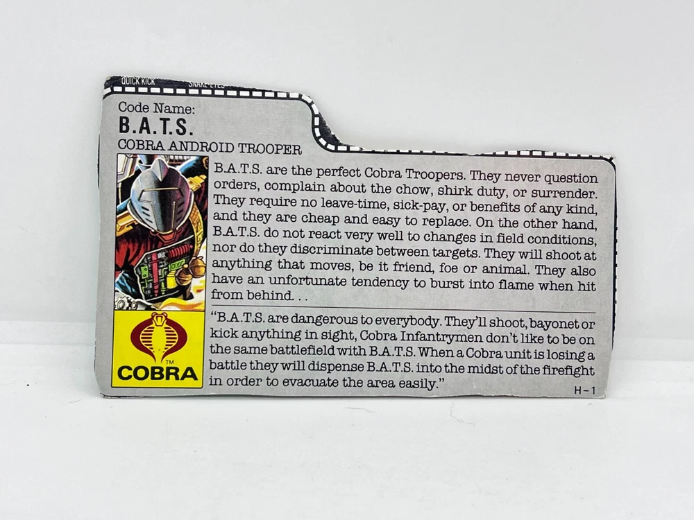 RETURNS ARE NOT ACCEPTED. Read listing carefully, look at pictures, ask questions RETURNS ARE NOT ACCEPTED. PLEASE see scans for condition _______________________________ 💥RARE 1986 GI Joe COBRA BAT Android Trooper 100% Complete file card💥 WOW - see photos for condition I will pack well and ship fast! my shipping charge is reflective of how much the USPS charges sellers these days to send items Especially to the west coast where most of my buyers are located for some reason. I can't afford to lose money shipping. _______________________________ RETURNS ARE NOT ACCEPTED. Read listing carefully, look at pictures, ask questions RETURNS ARE NOT ACCEPTED. PLEASE see scans for condition _______________________________