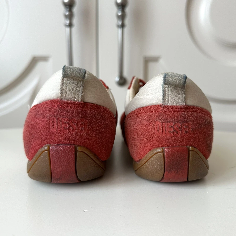 Size 7us - 2000s DIESEL ‘Valencia’ lace ballet flats. Incredible condition with little signs of use. Finished in white leather with red accents and a gum outsole. Features a really unique ope-front lace design. No box.