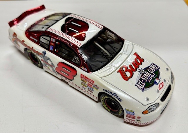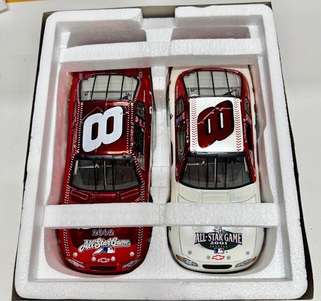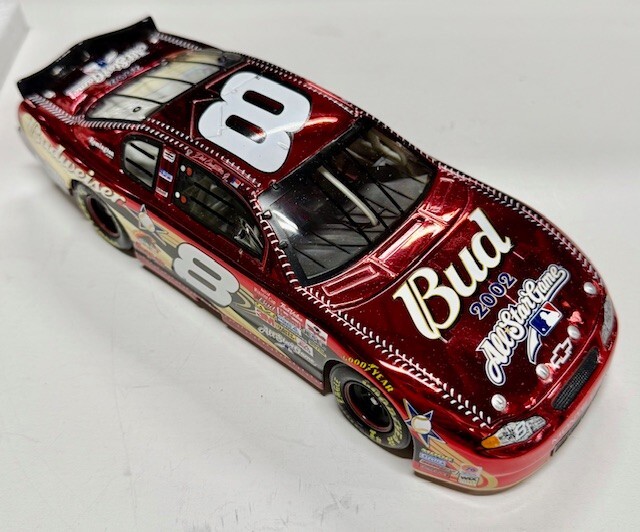 We have a rare 2001/2002 #8 Budweiser / All Star Game Dale Earnhardt Jr. 2 car set, featuring a Chevrolet Monte Carlo in color chrome. This diecast set includes two 1:24 scale cars, a limited edition collector's item with an original box and certificate of authenticity. It commemorates the NASCAR race series and All Star Games theme, making it a valuable addition for race fans and collectors interested in Dale Earnhardt Jr.'s racing career. This exclusive set was produced by Action Collectables, known for its high-quality replica vehicles for NASCAR enthusiasts. 1 of only 20,004. Local Collection is available in Boca Raton, Florida.