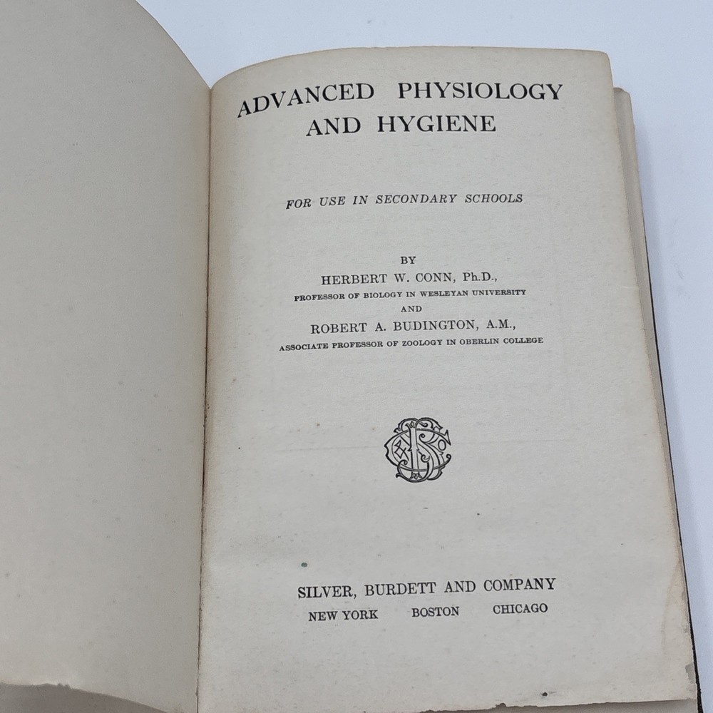 The product is an antique hardcover book titled "Advanced Physiology and Hygiene" by Herbert W. Conn & Robert A. Budington, published in 1909 by Silver, Burdett and Company. This first edition book is focused on the topic of physiology and is written in English. The authors are North American and the book was printed in the United States, making it a valuable collectible for those interested in science and medicine from the early 20th century.