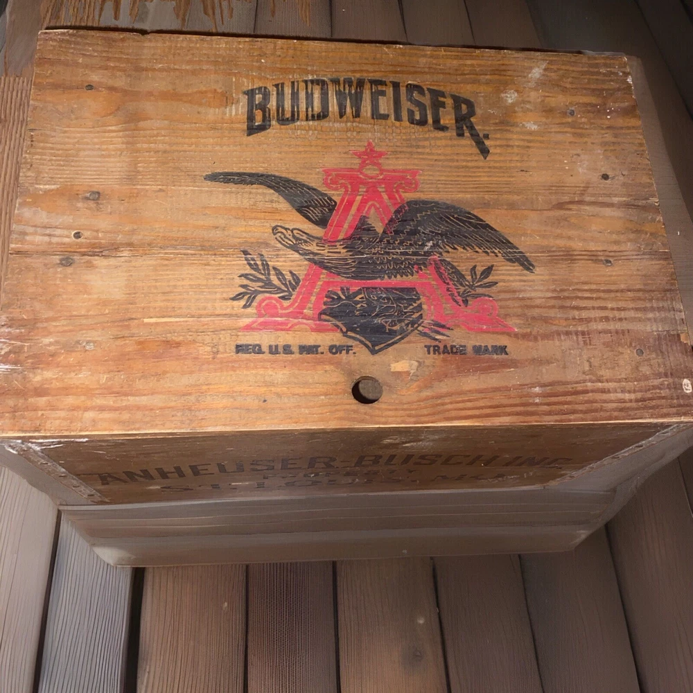 RARE very hard to cross paths with one of these crates that has the beer top checkers board on the underside of the crate Lid don’t miss this opportunity! There’s tons of these crates online for sale but this is the only one like such for sale online at this time I can locate and I have only personally seen one other crate myself with this game underside lid !! Crafted for enthusiasts of Americana and Breweriana, this Vintage Budweiser Wooden Crate Box celebrates the Centennial of Anheuser-Busch's storied brewery since 1876. The piece hails from the United States and bears the classic insignia of the iconic Budweiser brand, making it a must-have for collectors and fans of the storied brewery. The crate's robust build and historic significance offer a glimpse into the rich tapestry of American brewing heritage. It stands as a testament to the enduring legacy of one of the most recognized names in beer, and its presence in any collection is sure to be a conversation starter. Whether displayed as is or repurposed, this sign is a genuine piece of brewing history.