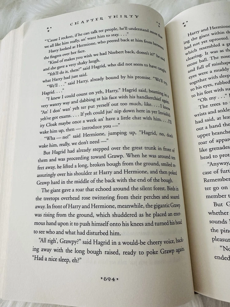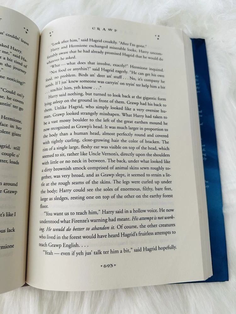 Pages 683/684- Original error made by the author when she stated "they found seats in the topmost row of the stands" only to find on the next page that Hagrid "had squeezed his way all along the row behind." This mistake was corrected in later editions.