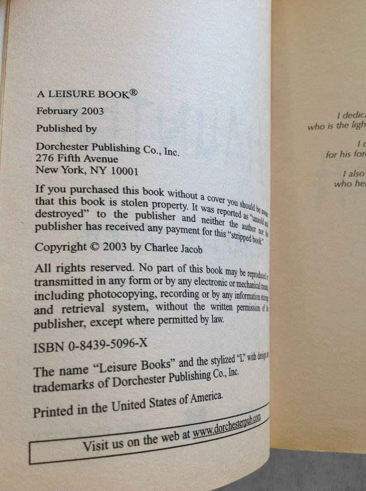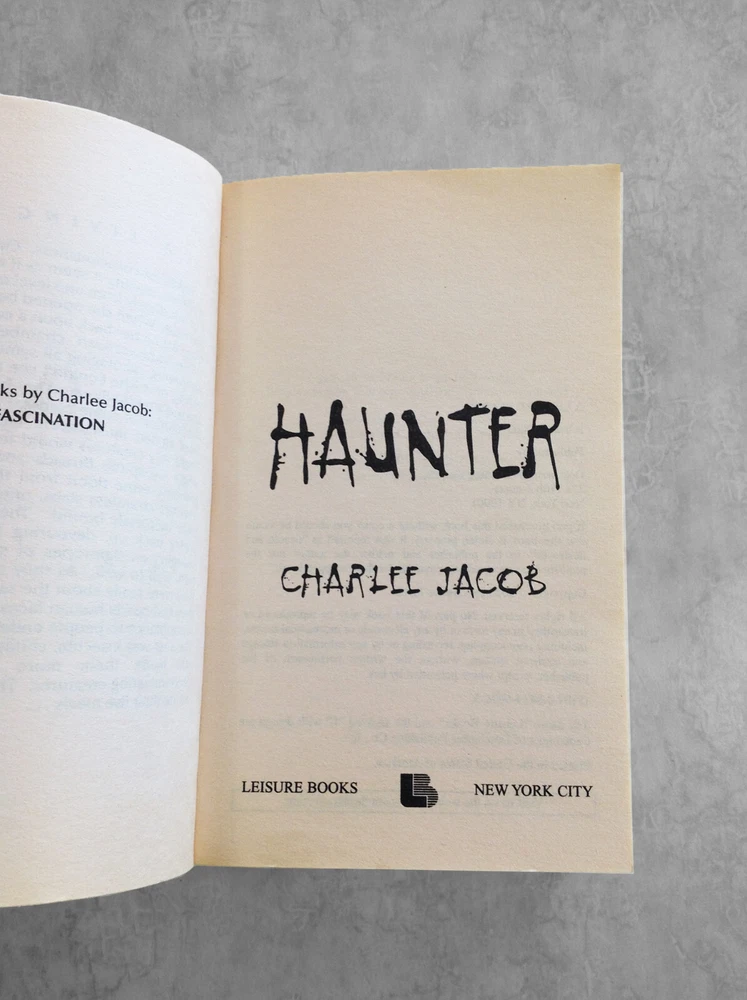 Haunter by Charlee Jacob. 2003, 1st Edition, Mass Market Paperback. Shipped with USPS. Cover has small tear bottom corner (see pics), otherwise it's in very good condition inside and out. Pages are clean. Binding is fairly tight. No missing or loose pages. Nice collectible copy overall.