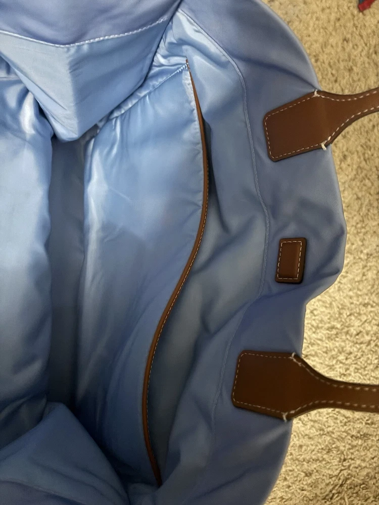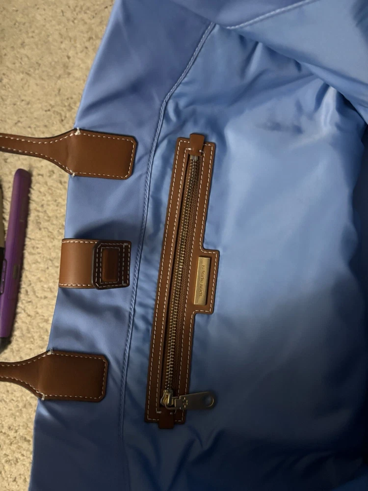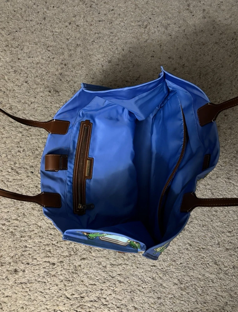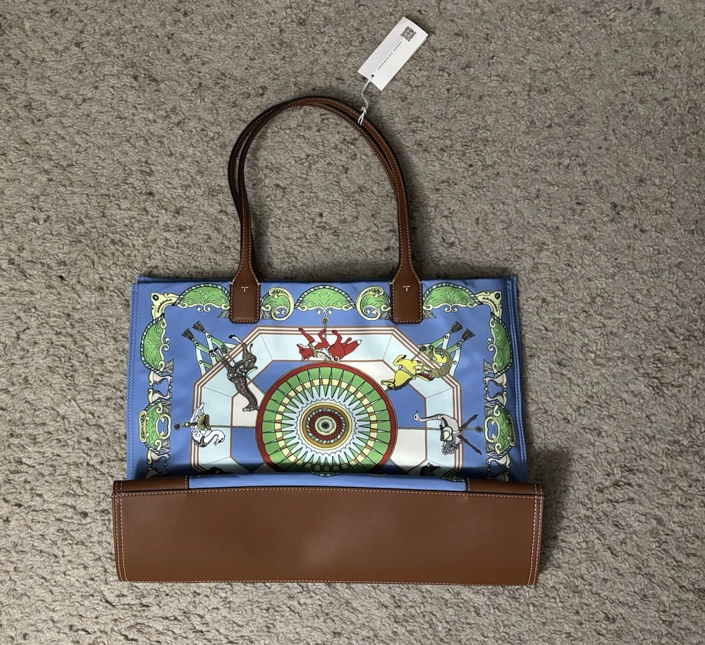 This Tory Burch Ella Large Tote in Blue Carousel is a rare and hard-to-find designer bag. With its beautiful floral pattern, magnetic closure, and double handles, this tote is perfect for any occasion, whether it be travel, wedding, party, or casual. The light blue exterior color and gold hardware color add a touch of elegance to the bag, while the brown handle/strap color gives it a classic and equestrian feel. The tote features inner pockets, lined with blue, and has a large size of 17 in width, 13 in height, and 5 in depth. It is made of high-quality polyester material and has brass hardware material. This limited edition bag is like new and comes with a EUC designation. The Tory Burch Ella Tote product line is known for its superior quality and this bag is no exception.