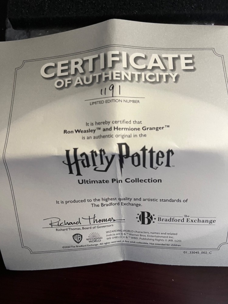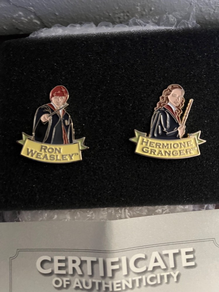 Bradford Exchange partnered with Warner Brothers and created a limited edition pin collection. This listing is for the Hermione and Ron pins. The set comes with the COA and this set is # 1199 and was available in 2020. Please see the photos. All sales are final. I will combine shipping whenever possible and I am selling my entire Harry Potter Collection. Please review photos carefully. All sales are final and items are sold as is.
