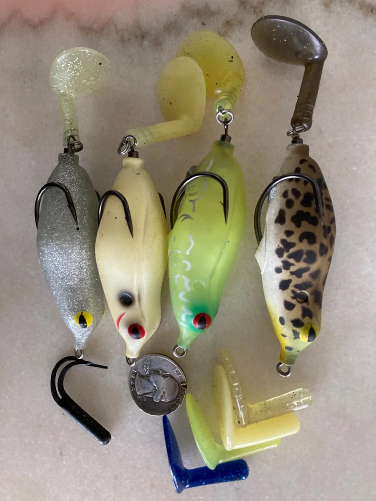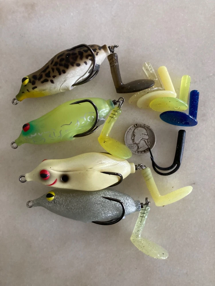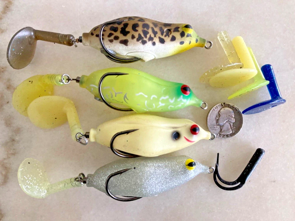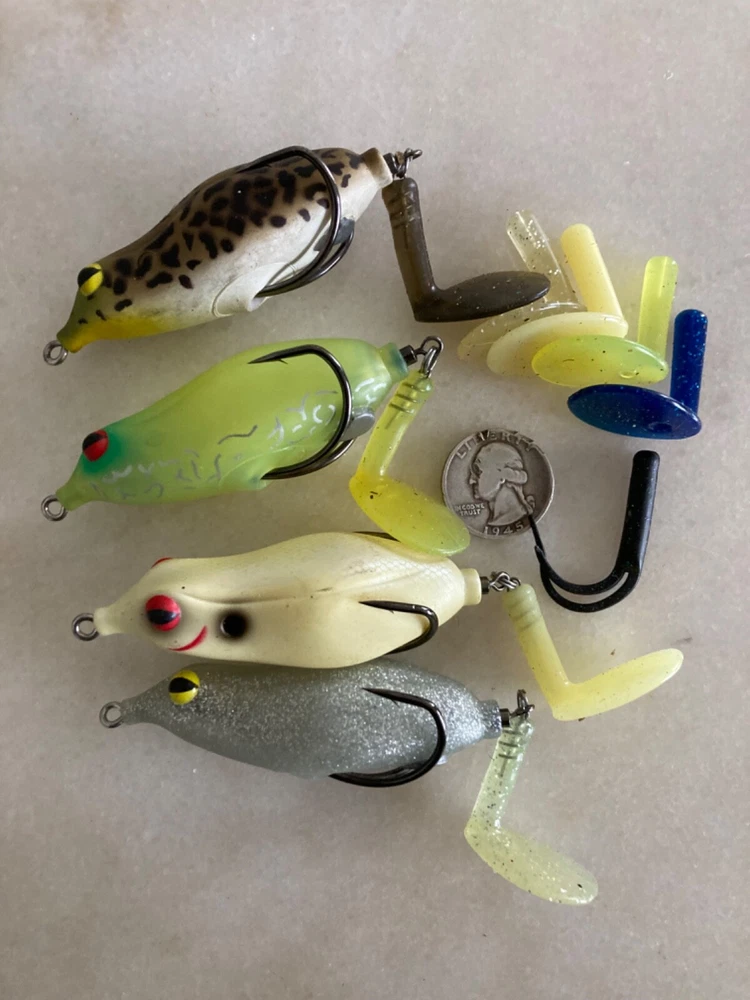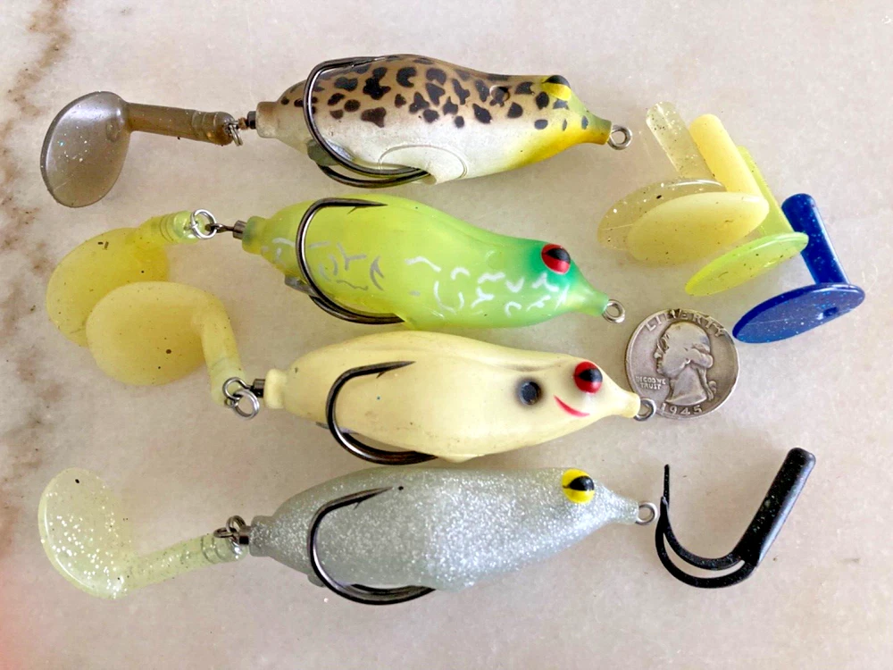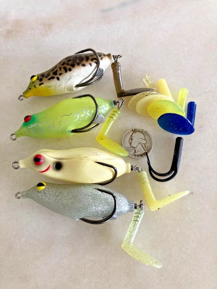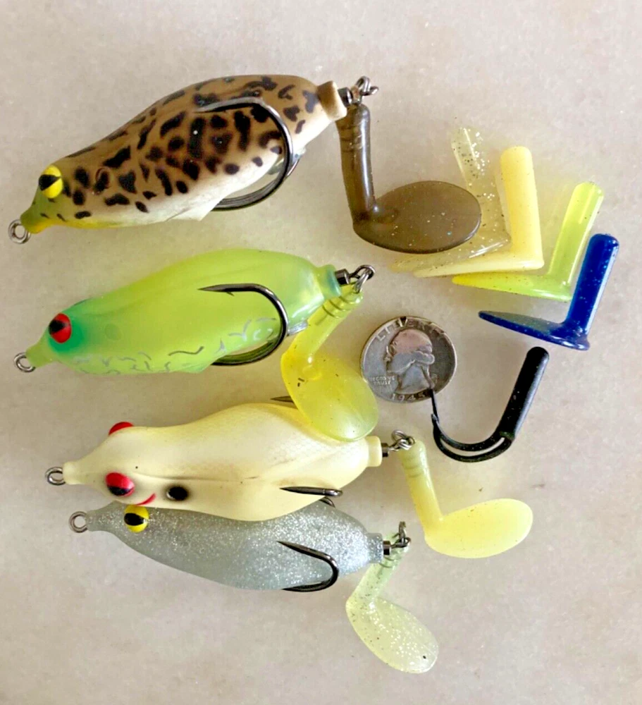 HOOKED-ON-VINTAGE IS SO PLEASED TO OFFER TOPWATER FROGS, RARE LOT 4 OF TECKLE TACKEL PADDLE TAIL FROG TOPWATER FISHING LURES CRANKBAIT FROGS WITH EXTRA PADDLE TAILS LEOPARD FROG SPOT. VTG LOT 4 WEEDLESS WEEDLESS LURES FROG SPOT TOPWATER SOFT FLOATER. SO SORRY THE U.S. QUARTER IS NOT INCLUDED WITH THESE LURES, IT IS MERELY TO SHOW SIZE / SCALE OF THE BAITS IN THE SUPER-SIZED PHOTOS. THIS LISTING IS FOR A NEW LOT OF 4 FROG FISHING LURES AS SHOWN IN THE PHOTOS, SOLD AS SHOWN IN THE SUPER-SIZE PHOTOS. I HAVE OTHER GREAT VINTAGE FISHING GEAR FOR SALE ON EBAY CURRENTLY, AND WE LOVE TO COMBINED THE SHIPPING TO SAVE YOU MONEY AND ALLOW YOU TO GET ALL THAT YOU WANT FOR YOUR COLLECTIONS, OR FOR GIFT GIVING. SOLD AS IS, AND AS SHOWN IN THE SUPER-SIZED PHOTOS. Please email us with any questions! Thank you for looking!