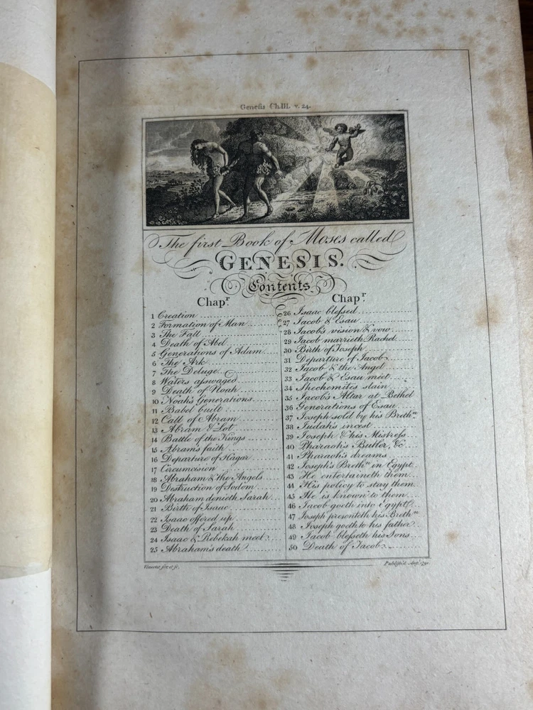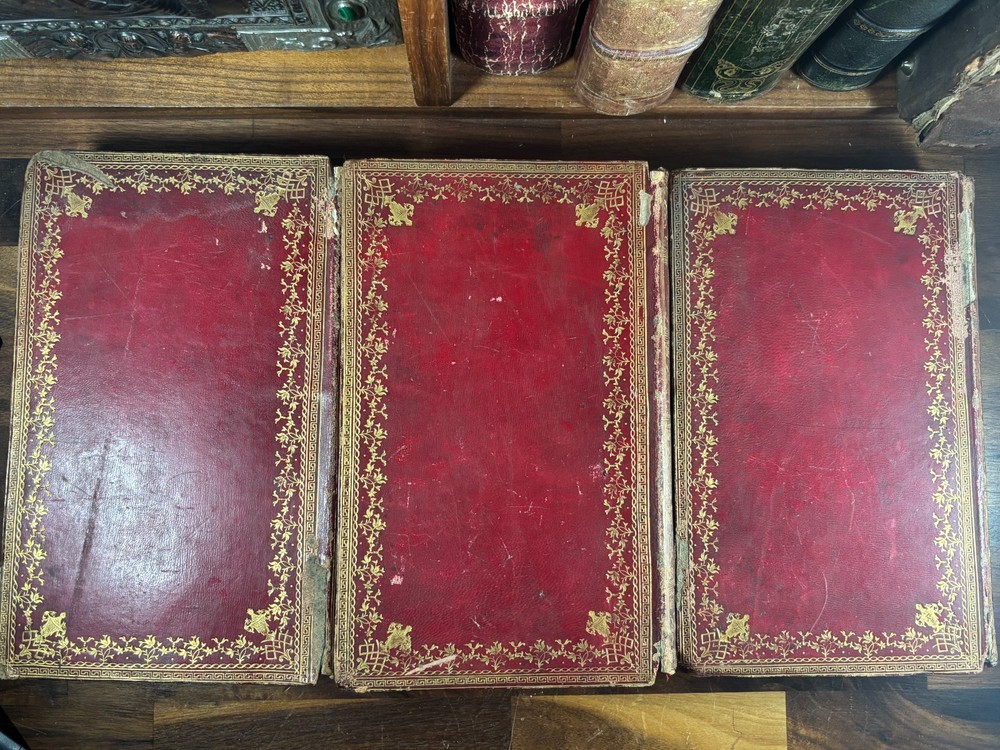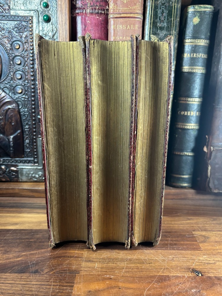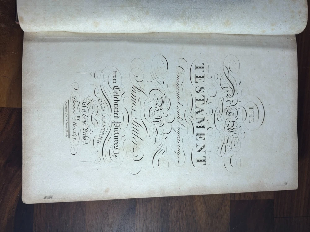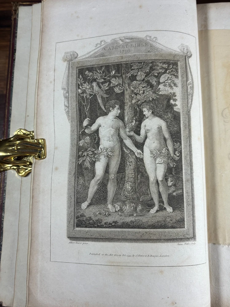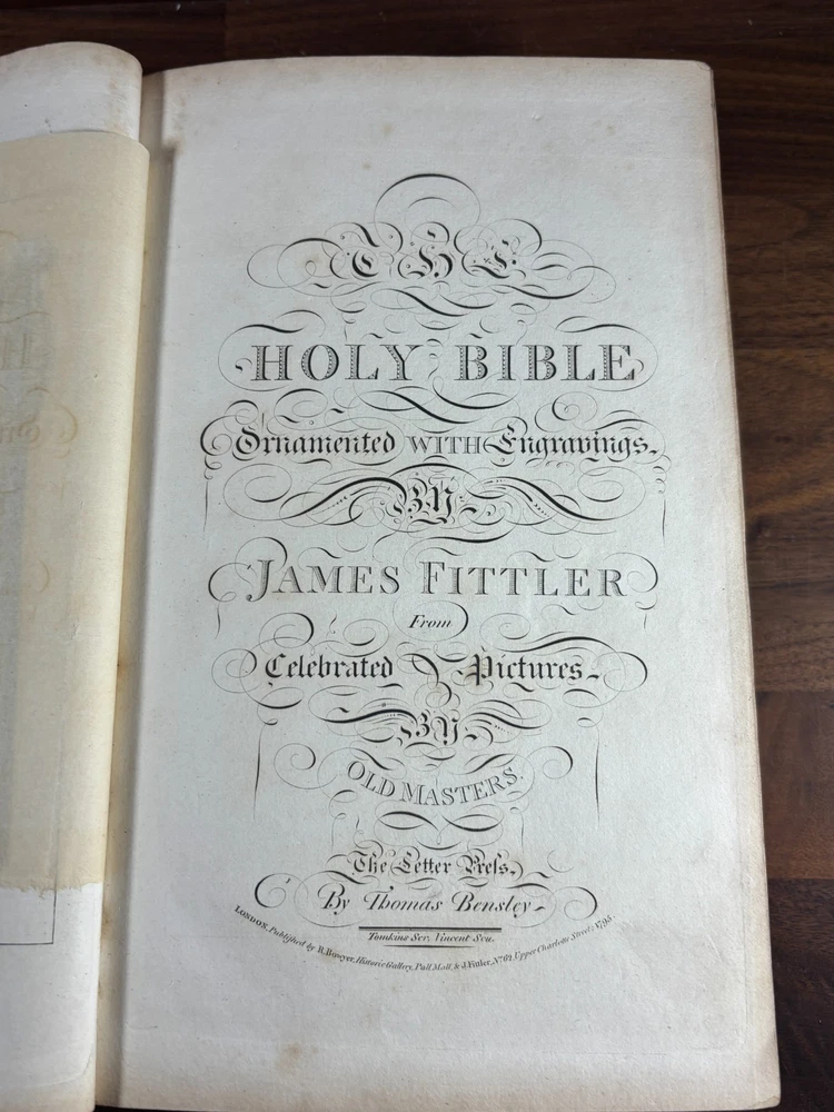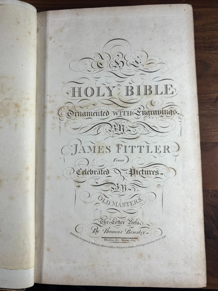 A finely produced late-Georgian illustrated edition of the Holy Bible, printed in London in 1795 and commonly known as the Fittler Cabinet Bible . Complete in three volumes. Format: Quarto (approx. 255 × 170 mm binding; text block 200 × 115 mm). Printed on laid paper. Copperplate engraved illustrations throughout. Contemporary gilt-tooled calf bindings with decorative Greek-key borders, urn tools, and spine compartments richly gilt. Spines lettered “Unique Cabinet Bible,” volumes numbered I–III. Marbled endpapers. Includes engraved titles and numerous copperplate plates after celebrated Old Masters, including works after Albrecht Dürer. Notable Textual Variant Mark 7:27: This copy contains a significant misprint in Mark 7:27, reading: “Let the children first be killed …” The correct King James Version text reads “filled.” The type appears cleanly set, indicating an original typesetting error rather than ink spread or damage. Such single-word errors were possible in hand-set late 18th-century printing, though examples preserved in complete sets are uncommon. This feature adds bibliographical interest to the present copy. James Fittler (1758 - 1835): James Fittler was one of the leading English engravers of the late 18th century. A pupil of Francesco Bartolozzi, he developed a reputation for refined line engraving and reproductive prints after major European paintings. He served as Marine Engraver to King George III and became an Associate of the Royal Academy. Fittler’s engravings are known for their clarity, controlled shading, and academic precision. The Cabinet Bible represents a substantial artistic undertaking, translating revered religious artworks into accessible engraved form for educated Georgian households. It reflects both devotional purpose and the era’s strong appetite for fine art reproduction. Historical Context: Published in 1795 during the reign of George III, this edition belongs to a period of high craftsmanship in English printing and copperplate engraving. The “Cabinet Bible” format was designed for cultured domestic libraries. Elegant, illustrated, and intended as both devotional text and decorative object. Printed by Thomas Bensley, one of London’s respected printers, and issued by publisher Robert Bowyer, this edition reflects the late-Georgian taste for finely illustrated religious works prior to full mechanization of printing in the 19th century. Large illustrated quarto Bibles such as this were substantial purchases at the time and often retained as heirloom volumes. Condition: • Complete in three volumes • Engravings present • Age toning and foxing can be found throughout • Rubbing to binding extremities • Structurally sound Dimensions (Complete set): Weight - 3.75KG Height - 25.5cm Width - 17cm Thickness - 13.5cm